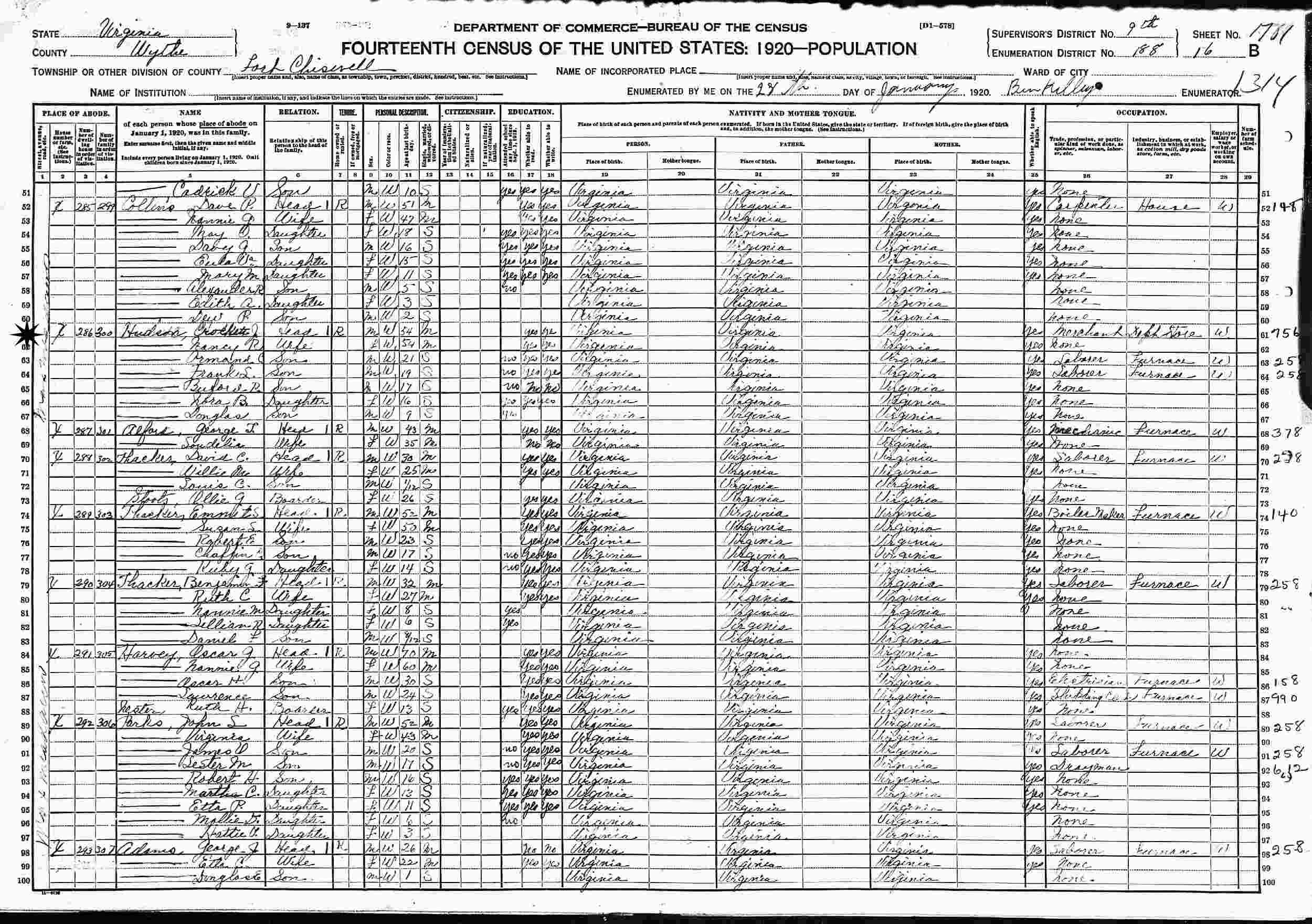 January 28, 1920 - Supervisor's District 9, Enumeration District 188, Max Meadows, Fort Chiswell, Wythe County, Virginia.