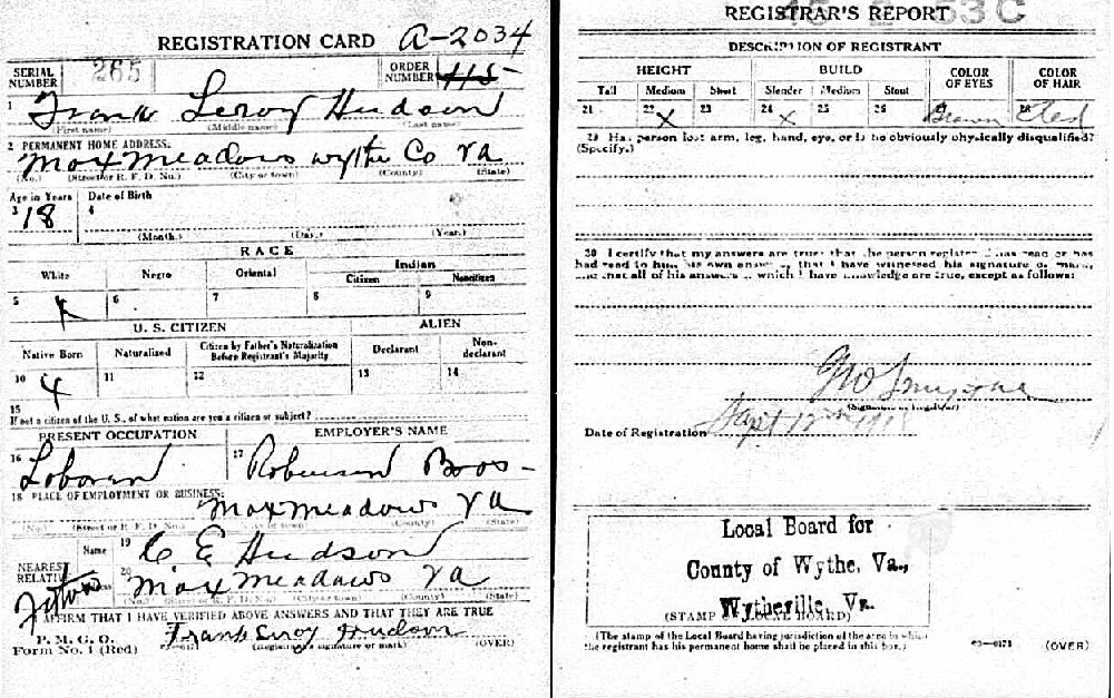 September 12, 1918 - Max Meadows, Wythe County, Virginia.