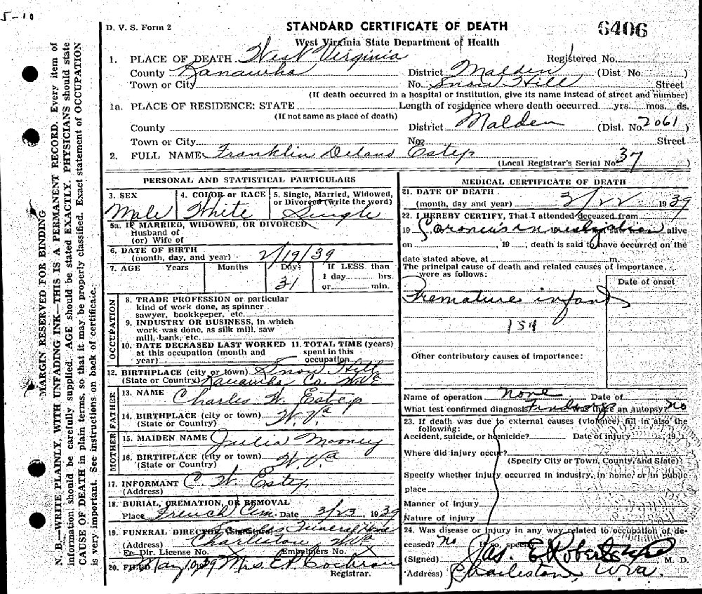 Died: February 25, 1939 in Snow Hill, Malden District, Kanawha County, West Virginia.