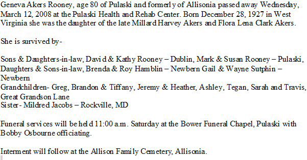 Notes for GENEVA ALICE AKERS ROONEY: