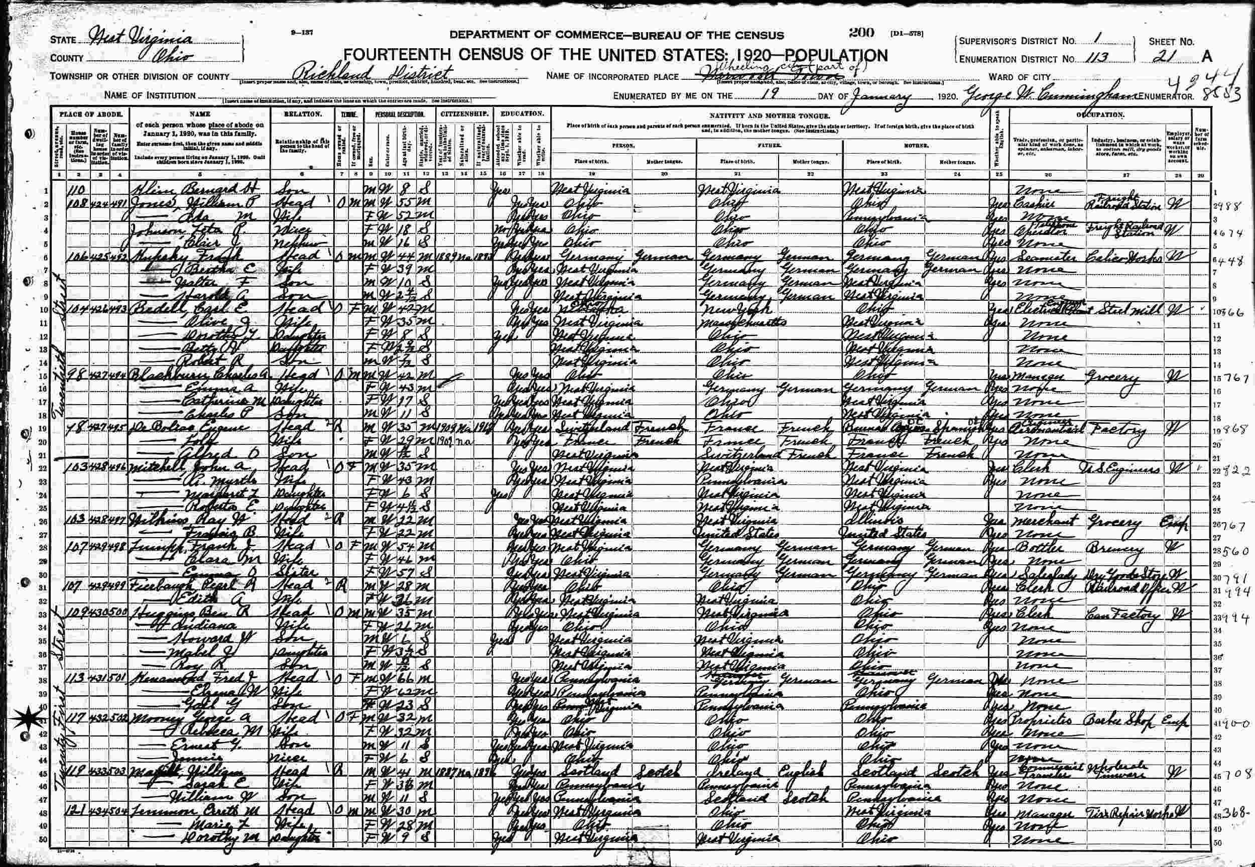 January 19, 1920 - 117 Twenty First Street, Supervisor's District 1, Enumeration District 113, Richland District, Wheeling City, Ohio County, West Virginia.
