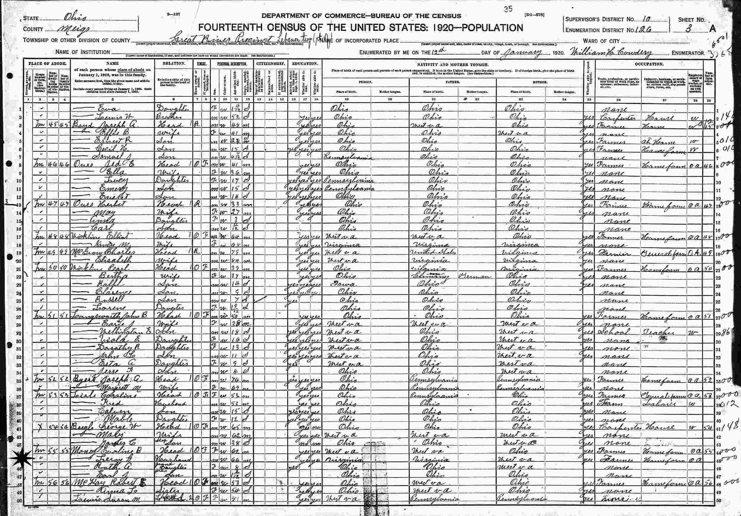 January 12, 1920 - Supervisor's District 10, Enumeration District 126, Great River Precinct, Lebanon Township, Meigs, County, Ohio.