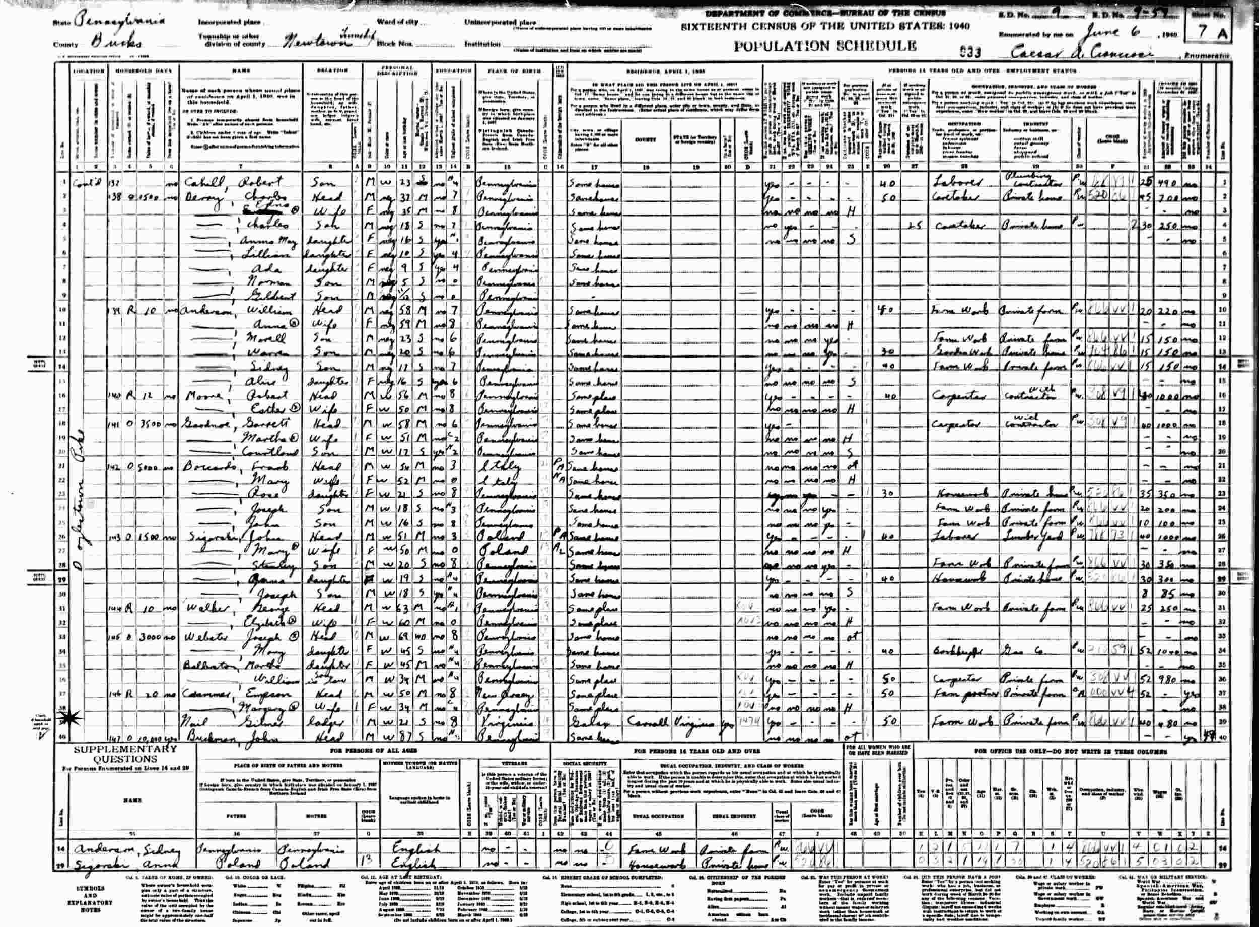 June 4, 1940 - Doylestown Pike, Newtown Township, Supervisor's District 9, Enumeration District 9-59, Bucks County, Pennsylvania (Lodger).