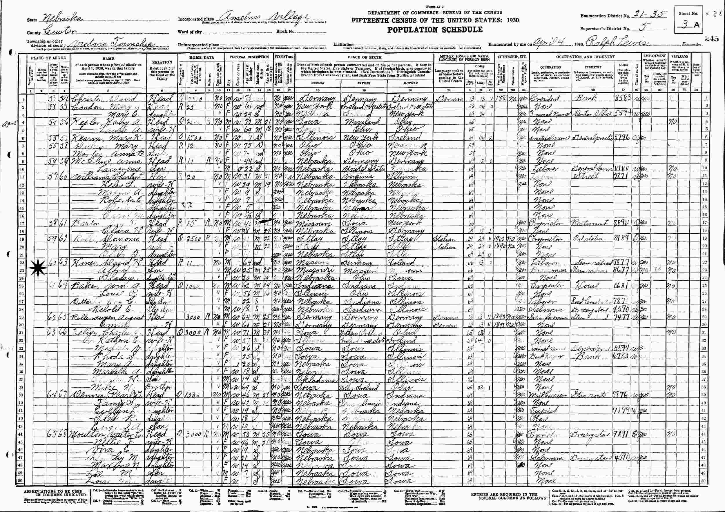 April 5, 1930 - Supervisor's District 5, Enumeration District 21-35, Victoria Township, Anselmo Village, Custer County, Nebraska.