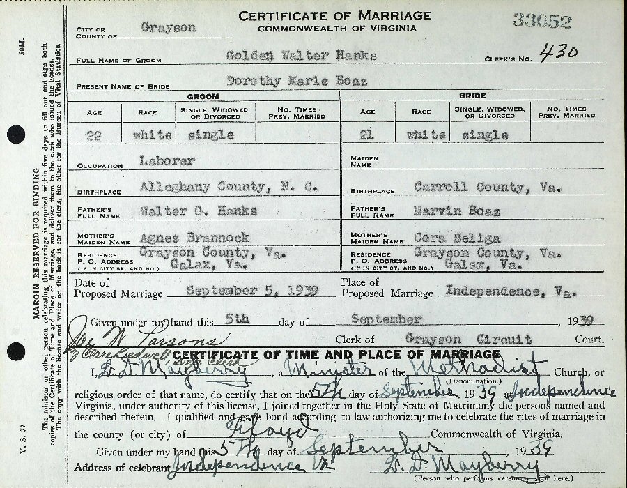 Married: Dorothy Marie Boaz September 5, 1939 in Independence, Virginia.