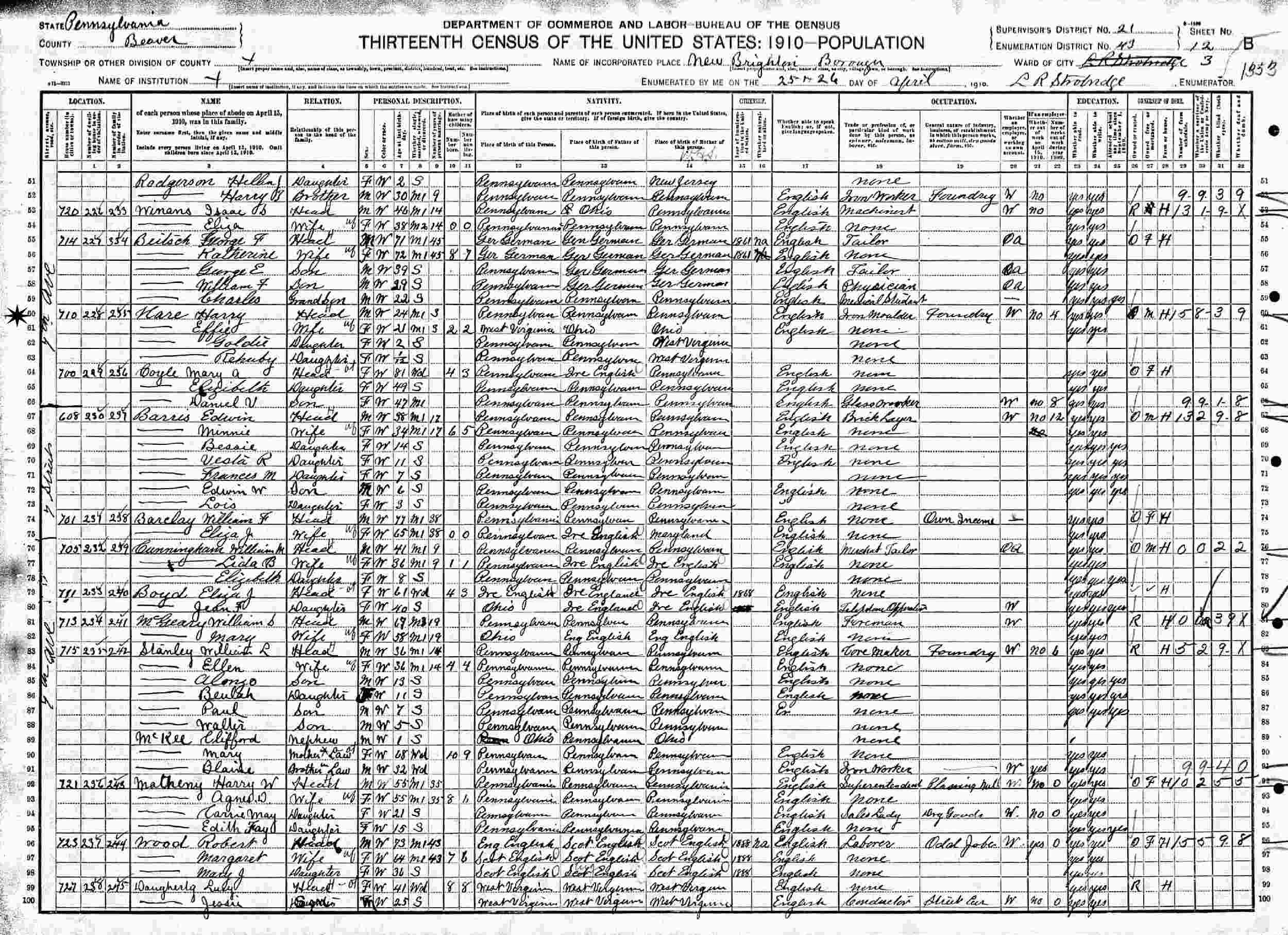 April 25-26, 1910 - 710 7th Avenue, Ward 3, Supervisor's District 21, Enumeration District 43, New Brighton, Beaver County, Pennsylvania.