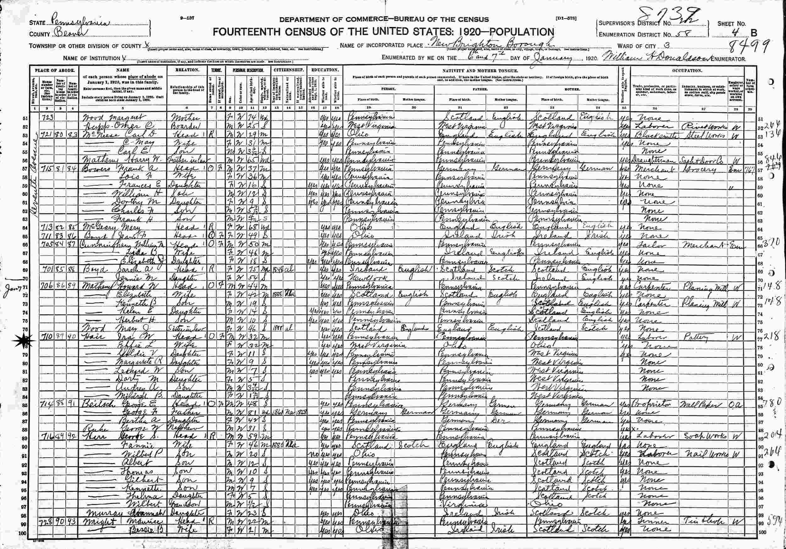 January 6-7, 1920 - 710 7th Avenue, Ward 3, Supervisor's District 22, Enumeration District 58, New Brighton, Beaver County, Pennsylvania.