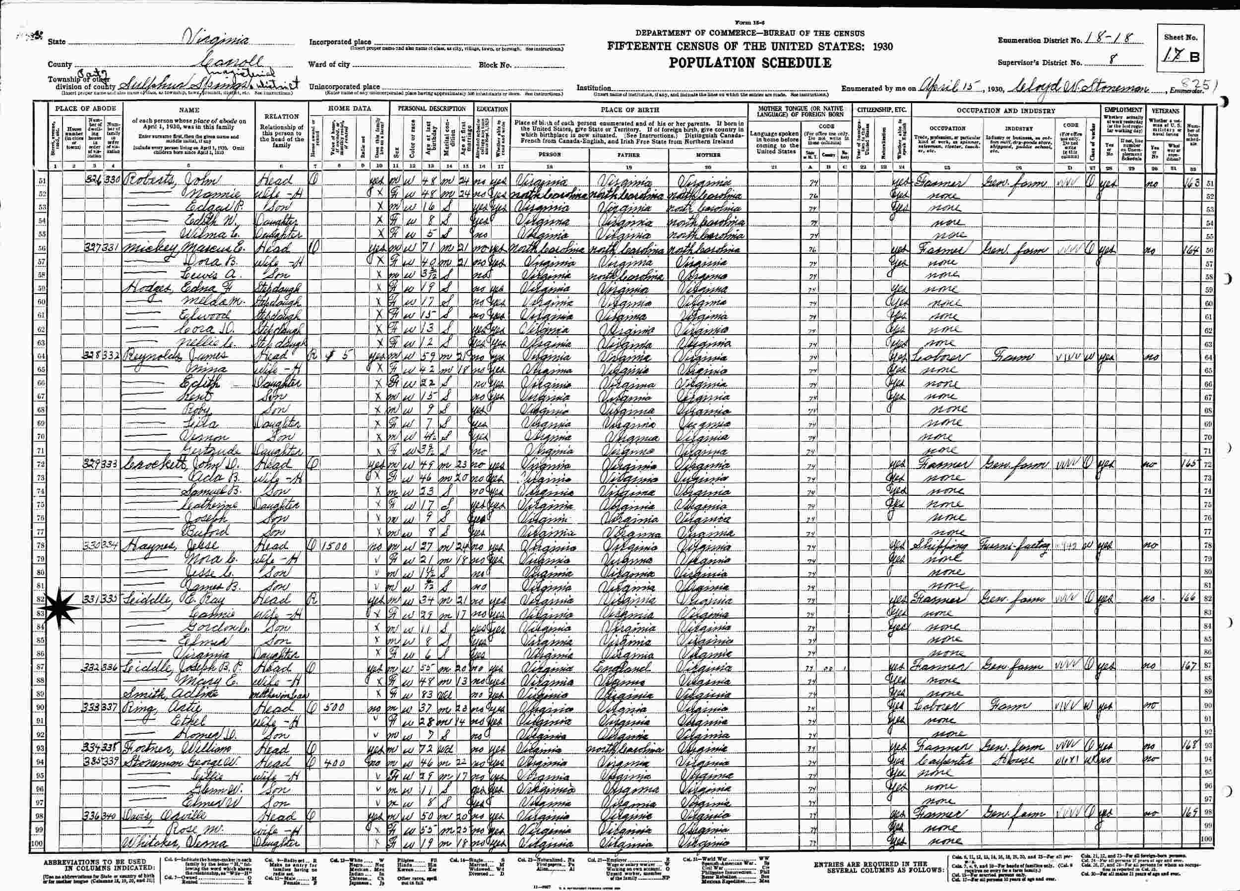 April 15, 1930 - Sulpher Springs Magisterial District, Supervisor's District 8, Enumeration District 18-18, Carroll County, Virginia.
