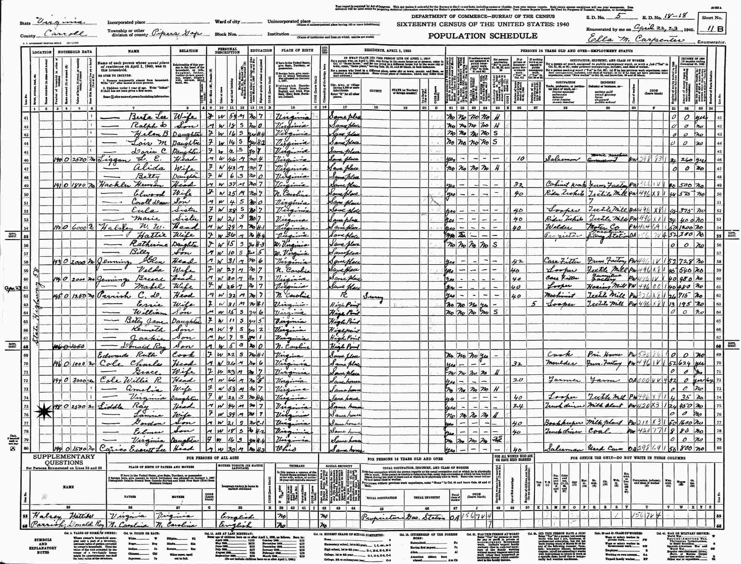 April 23, 1940 - State Highway 58, Pipers Gap, Supervisor's District 5, Enumeration District 18-18, Carroll County, Virginia.