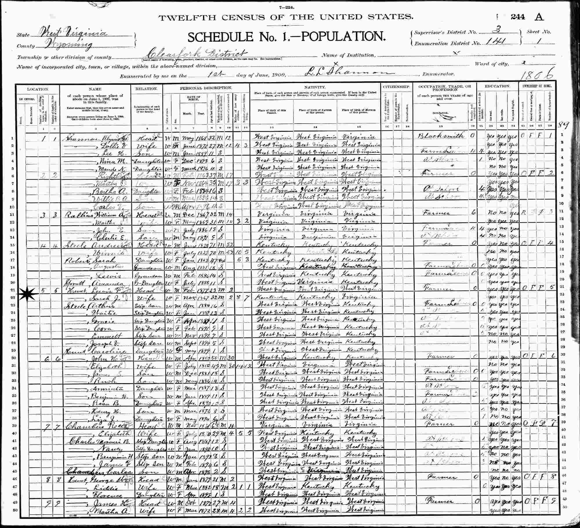 June 1, 1900 - Supervisor's District 3, Enumeration District 141, Clear Fork District, Wyoming County, West Virginia.