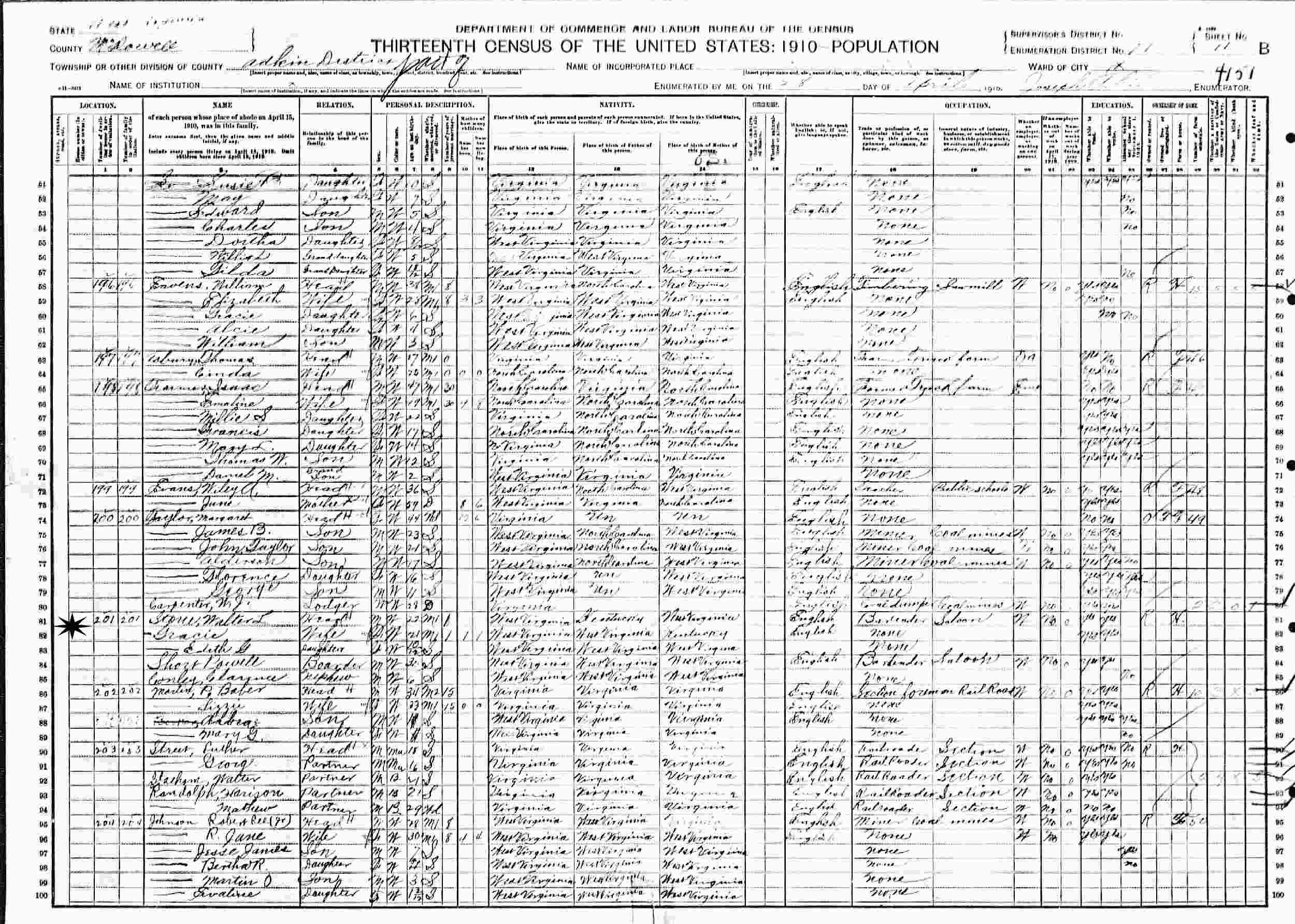 April 28, 1910 - Enumeration District 21(?), Adkins District, McDowell County, West Virginia.