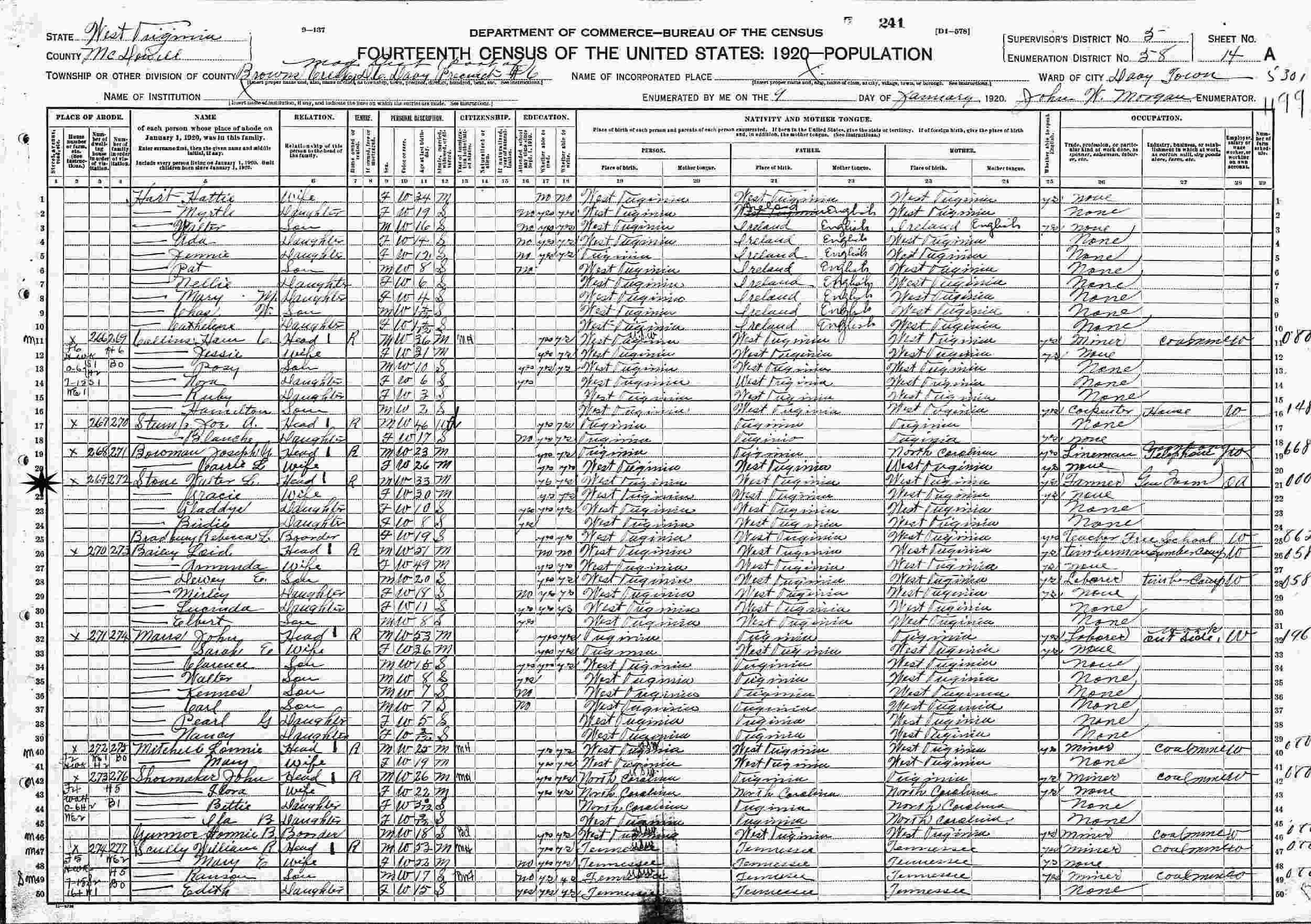 January 9, 1920 - Supervisor's District 6, Enumeration District 58, Browns Creek, McDowell County, West Virginia.