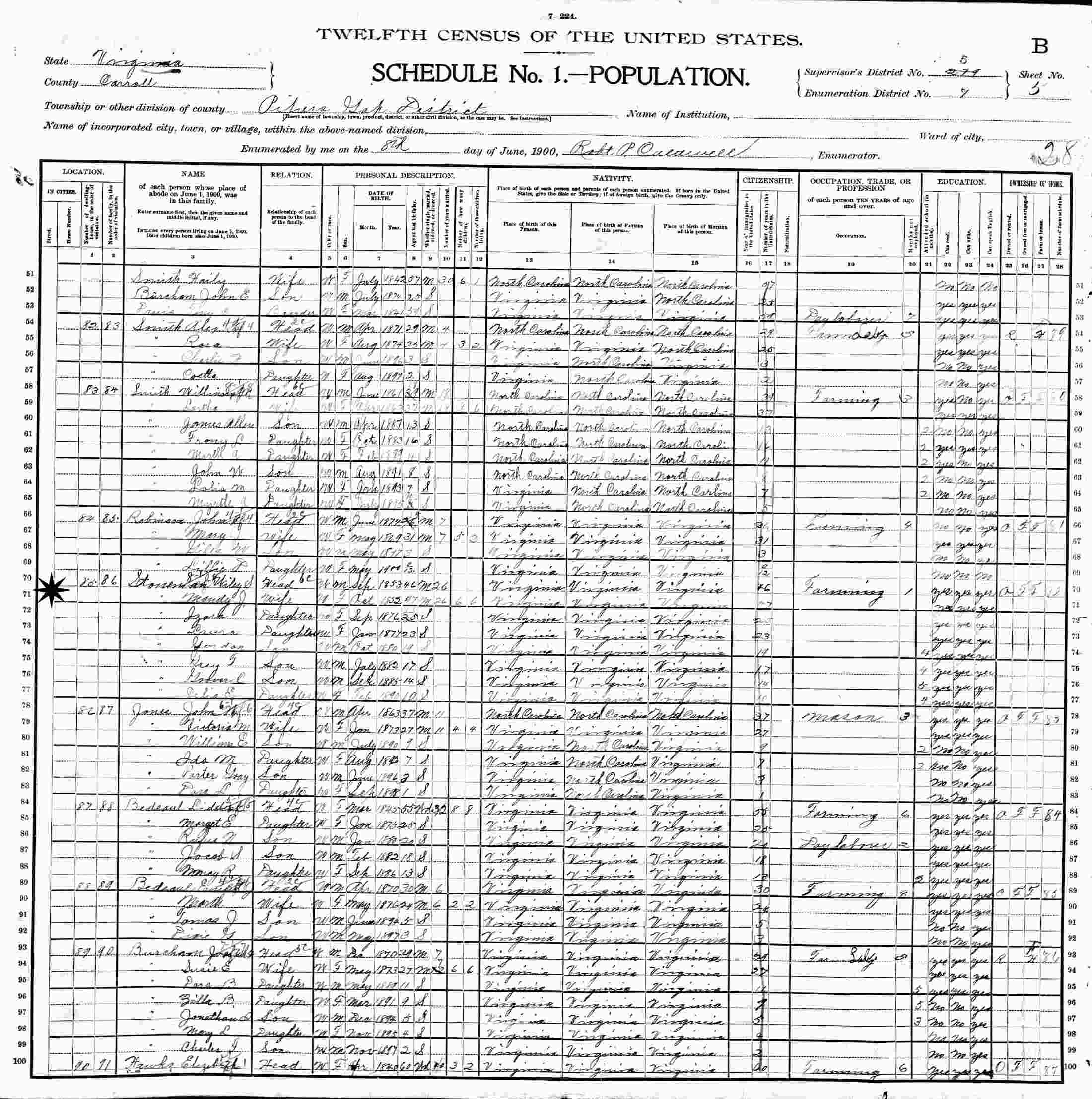 June 8, 1900 - Pipers Gap District, Supervisor District 279, Enumeration District 7, Carroll County, Virginia.