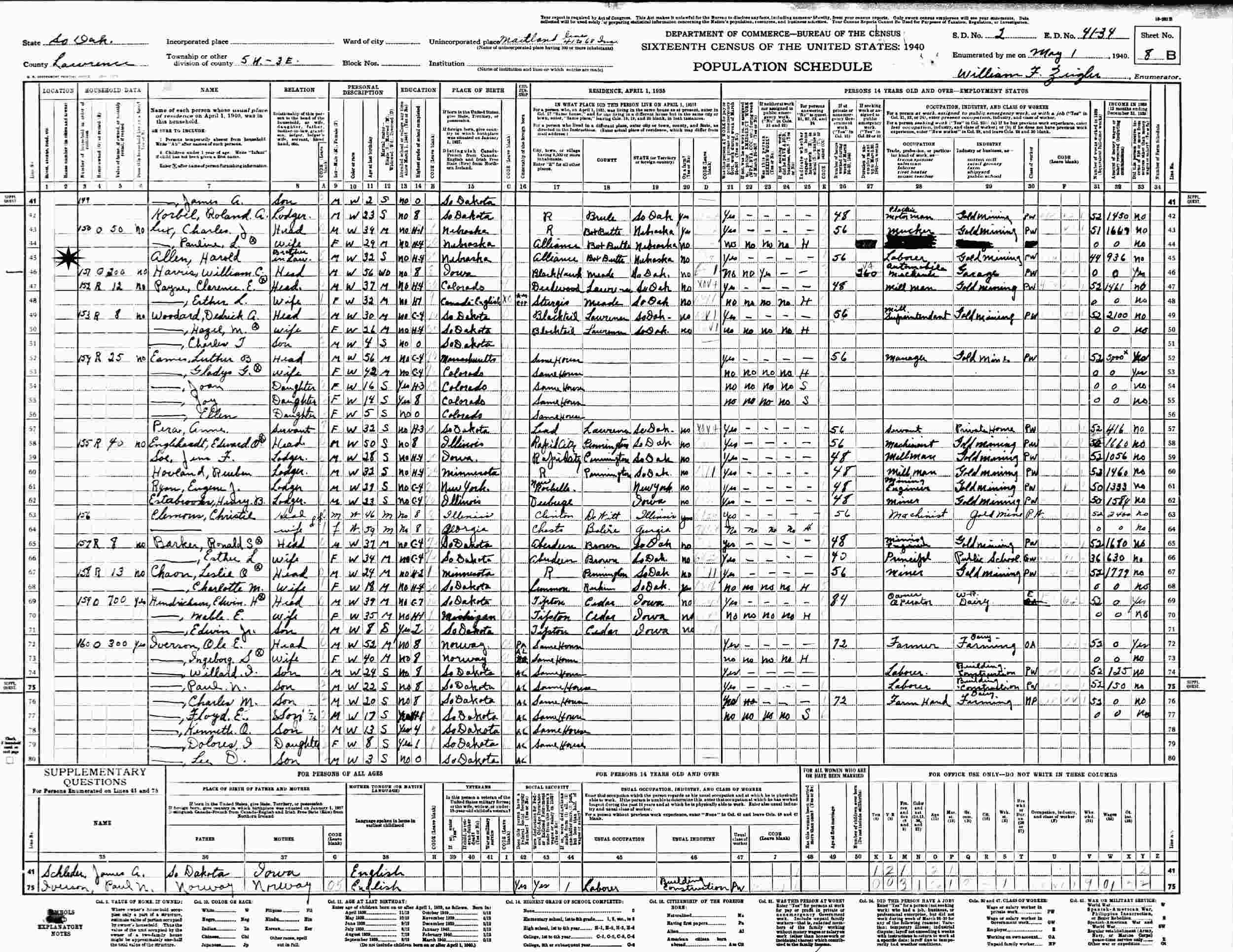 May 1, 1940 - Township 5, Range 3, Supervisor's District 2, Enumeration District 41-34, Lawrence County, South Dakota (w/sister and brother-in-law, Pauline and Charles Lux).