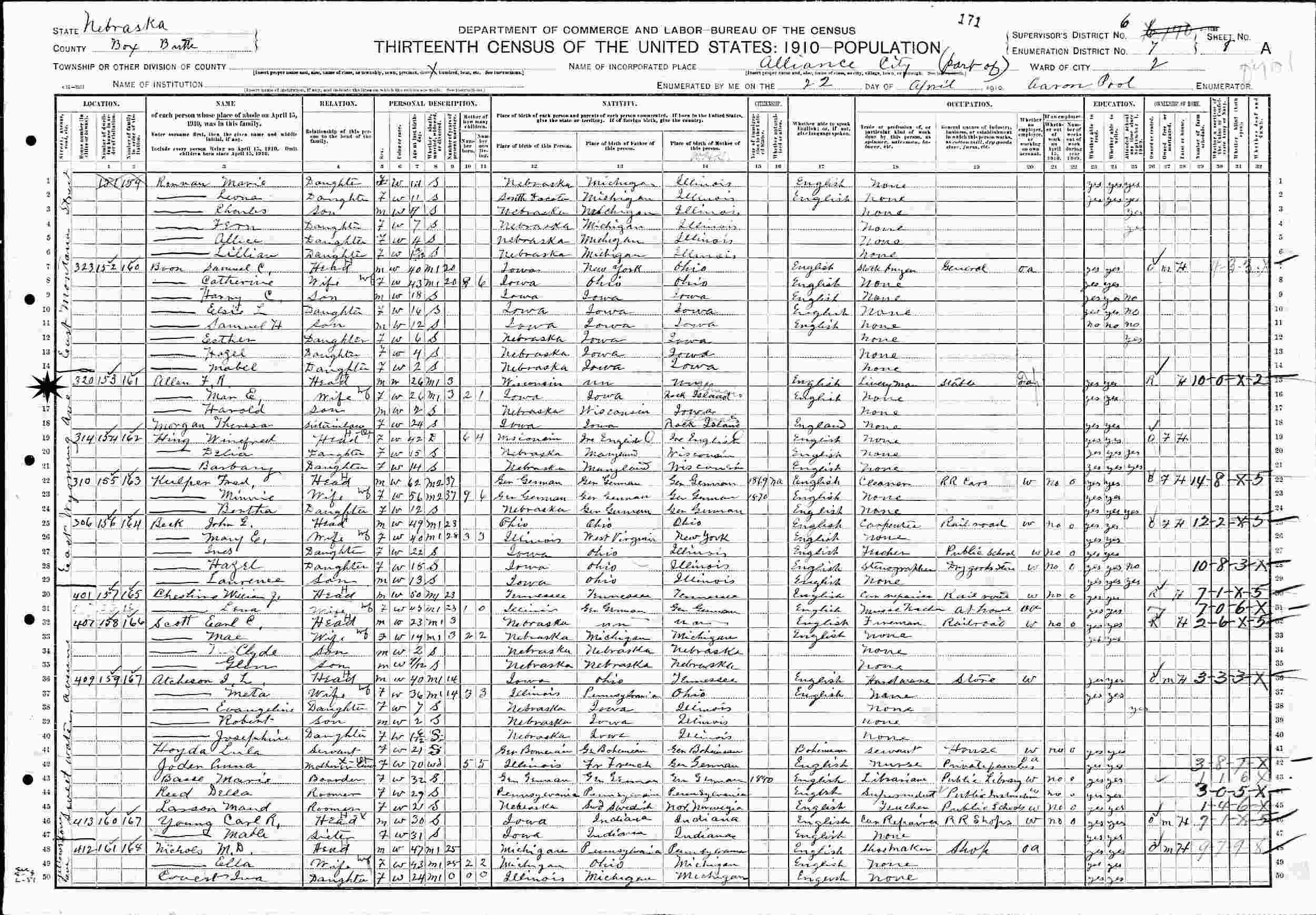 April 22, 1910 - East Wyoming Avenue, Ward 2, Supervisor's District 6, Enumeration District 2, Alliance, Box Butte, County Nebraska.