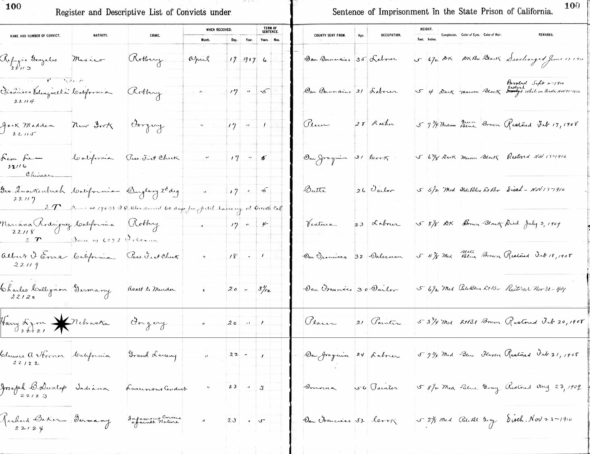 April 20, 1907 - San Quentin Prison, San Quentin, Marin County, California. (Released: Febuary 20, 1908. Place of Crime/Crime: Placer County, California; Forgery.)