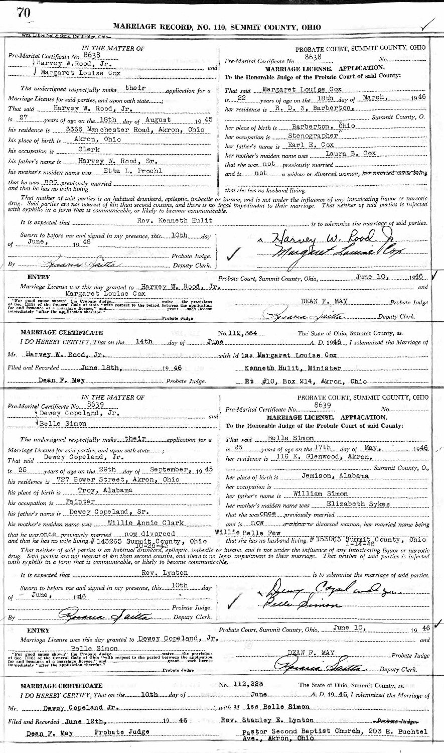 Married: Margaret Louise Cox June 10, 1946 in Akron, Summit County, Ohio.