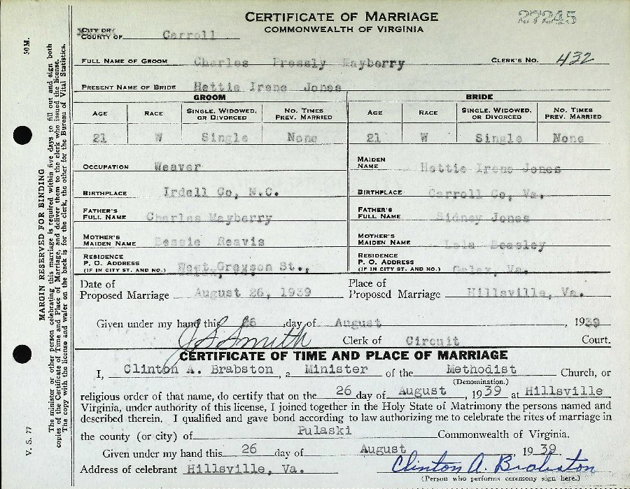 Married: (1) Charles Pressly Mayberry August 26, 1939 in Hillsville, Carroll County, Virginia.