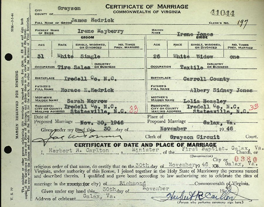(2) James Hedrick November 30, 1936 in Galax, Virginia.