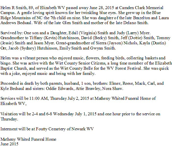 Died: June 28, 2015 in Camden Clark Memorial Campus Hospital, Parkersburg, Wood County, West Virginia.