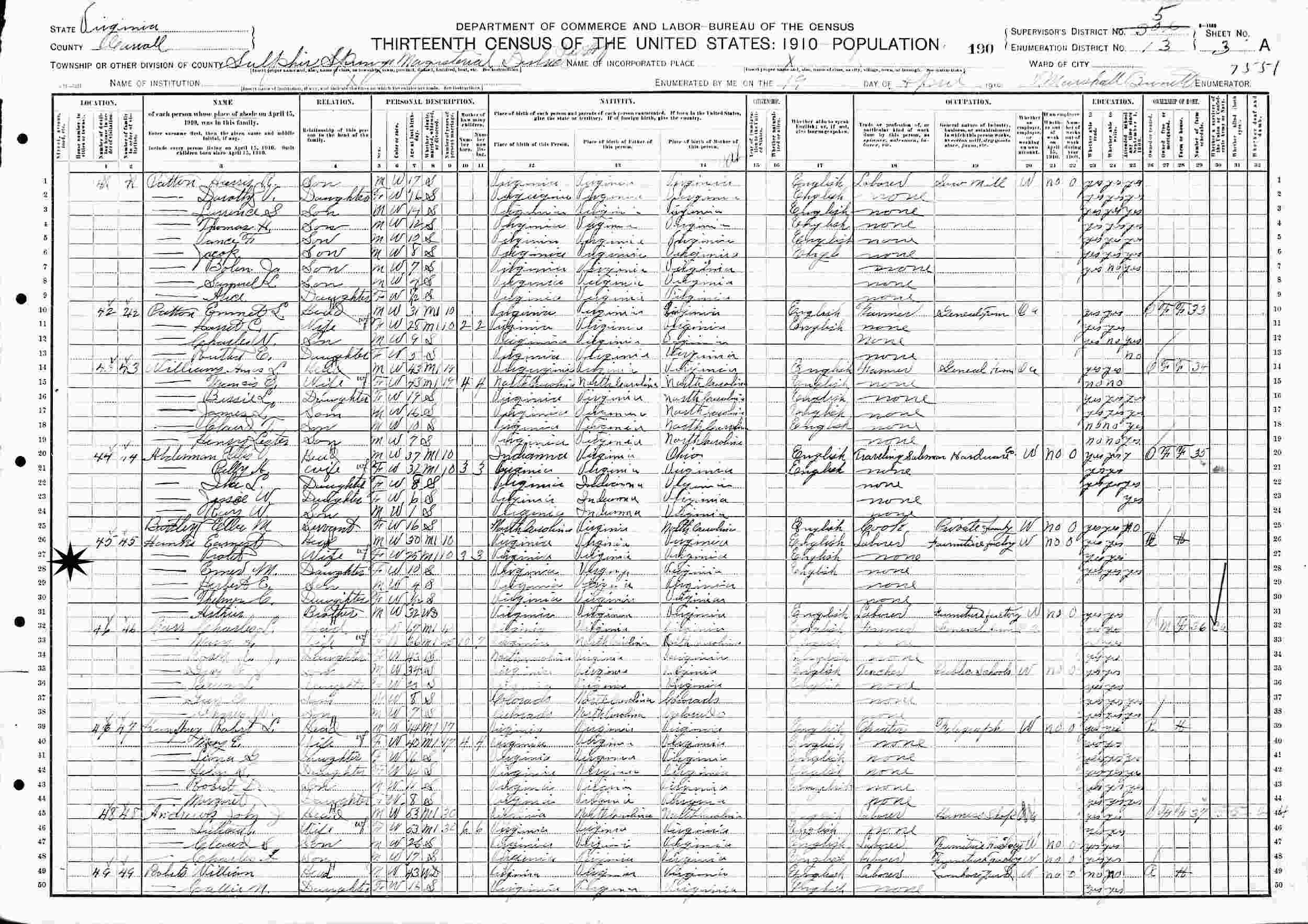 April 19, 1910 - Sulphur Springs Magisterial District, Supervisor's District 5, Enumeration District 13, Carroll County, Virginia.