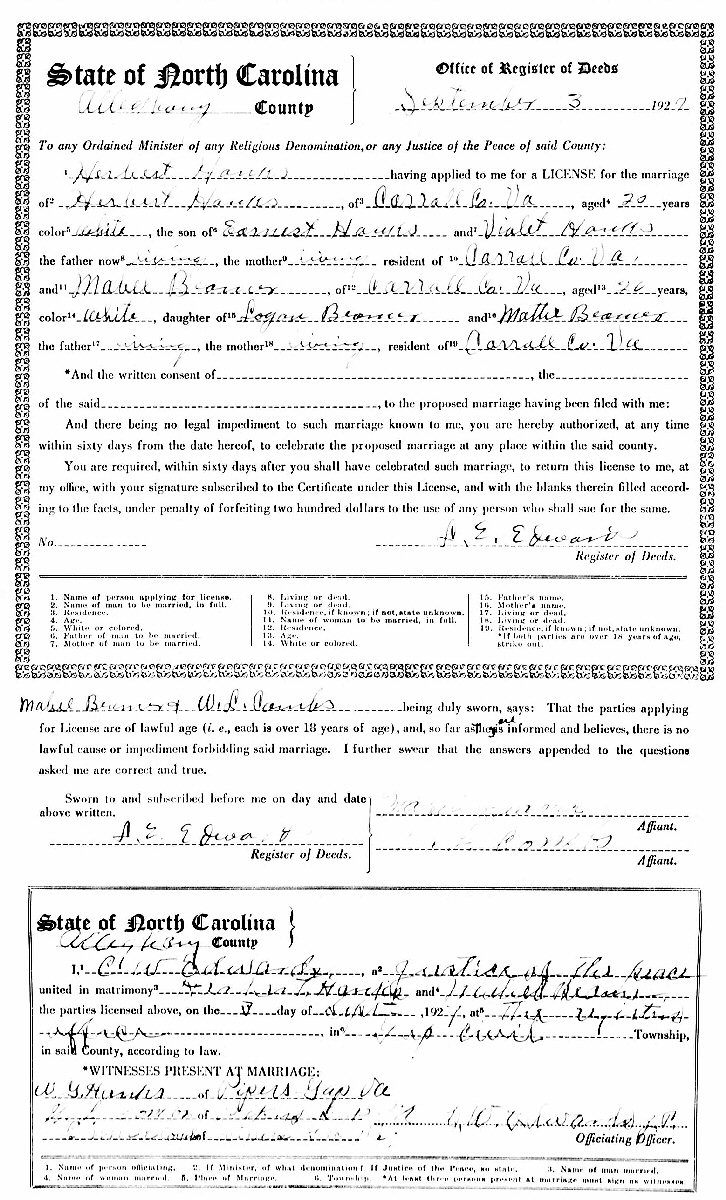 Married: (1) Mabel Nina Beamer September 3, 1927 in Allgehany County, North Carolina.