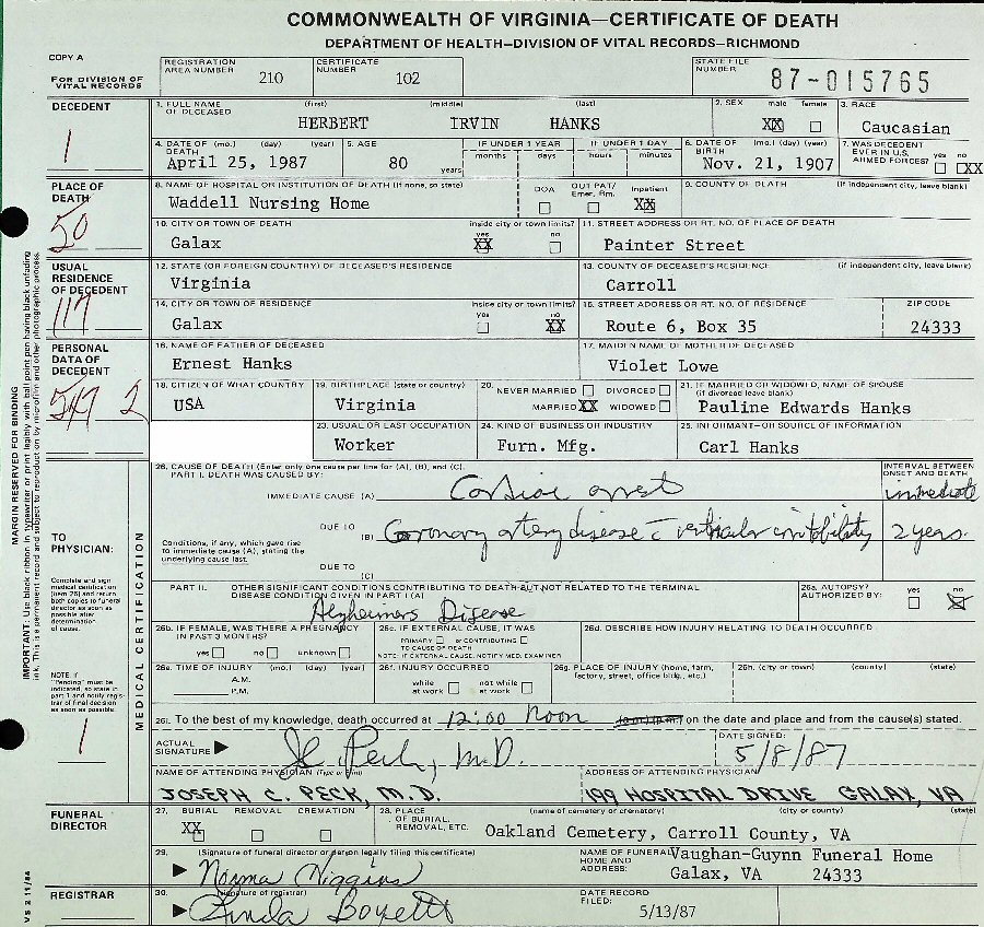 Died: April 25, 1987 in Waddell Nursing Home, Galax, Virginia.