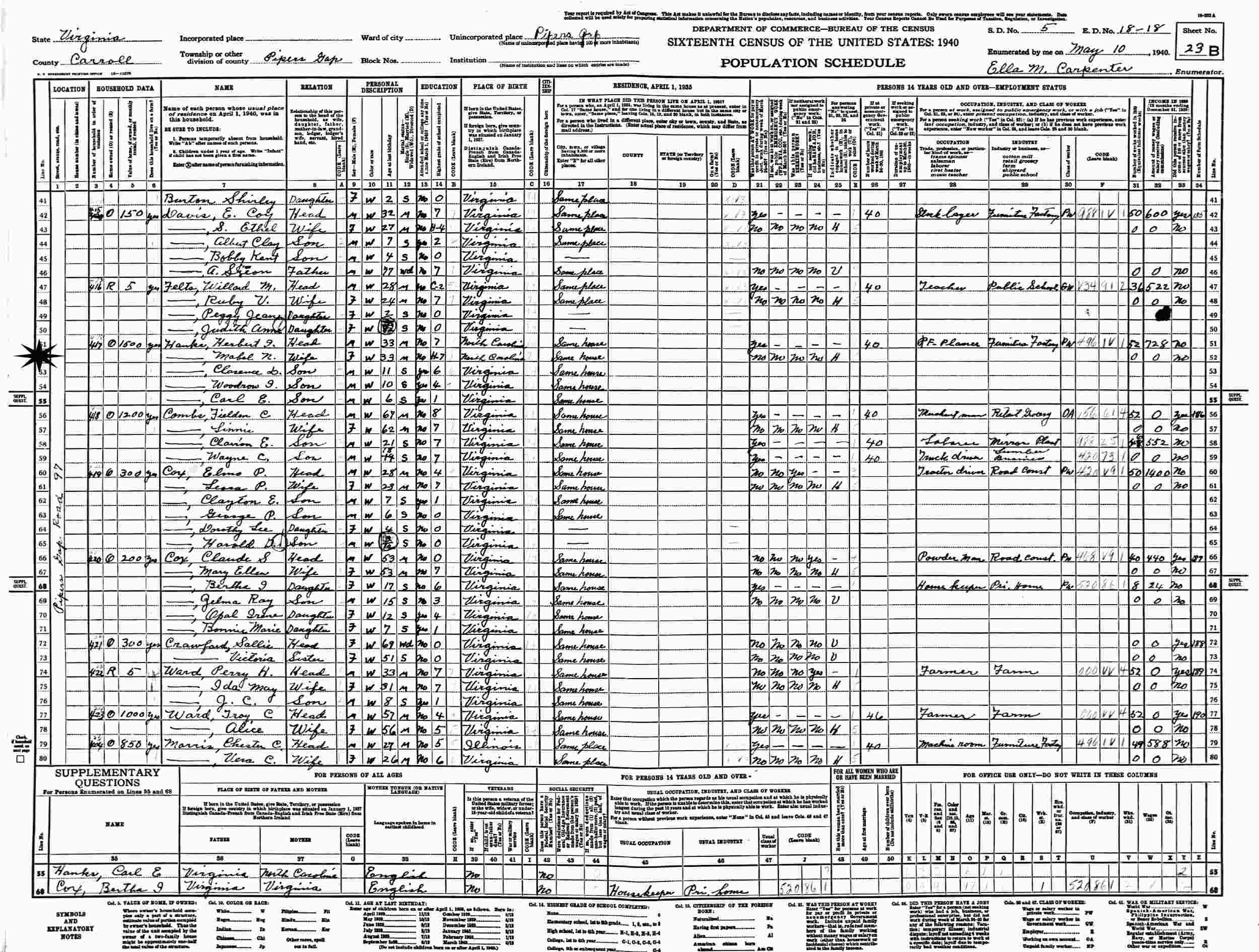 May 10, 1940 - Pipers Gap Road 97, Supervisor's District 5, Enumeration District 18-18, Pipers Gap, Carroll County, Virginia.