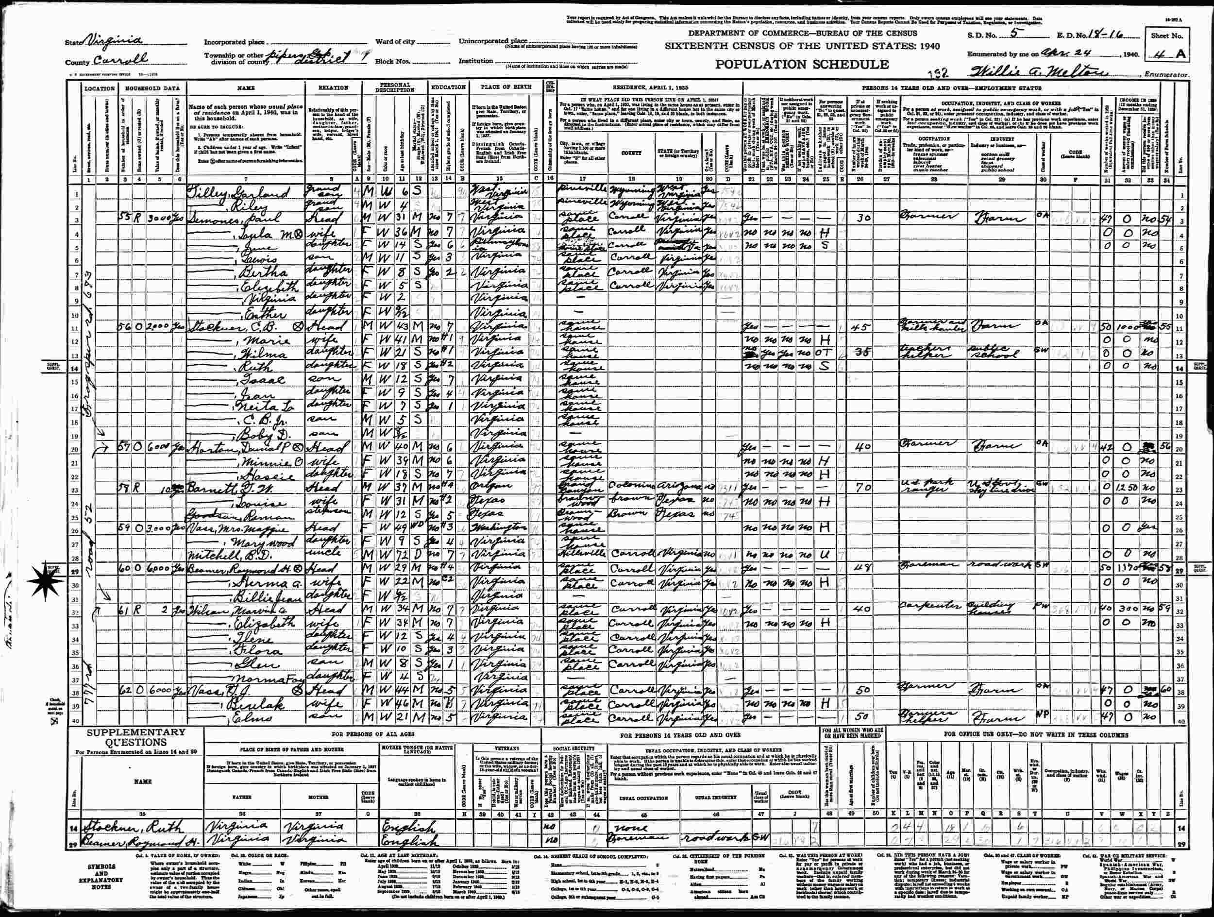 April 24, 1940 - Pipers Gap, Supervisor's District 5, Enumeration District 18-16, Carroll County, Virginia.