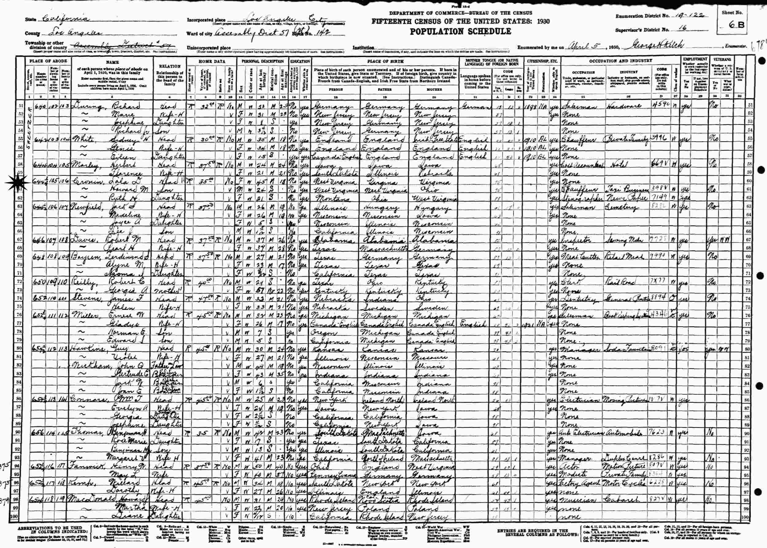 April 5, 1930 - 644 1/4 Sweetzer, Assembly District 57, Block 142, Supervisor's District 16, Enumeration District 19-122, Los Angeles, Los Angeles County, California (w/mother)