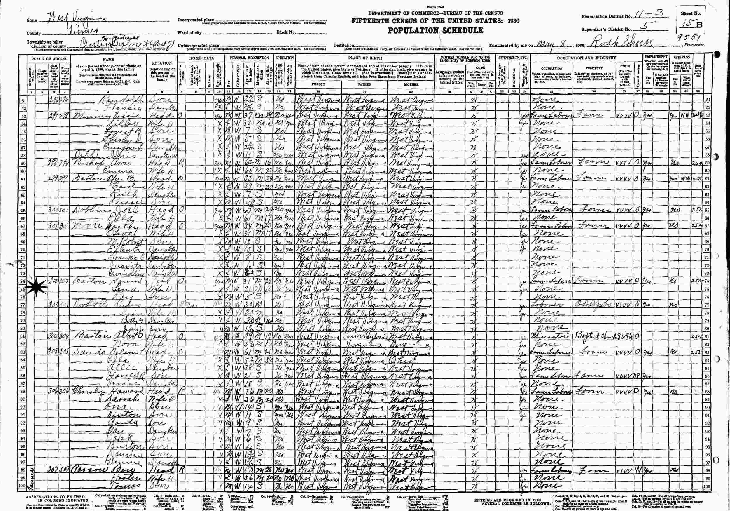 May 8, 1930 - Supervisor's District 5, Enumeration District 11-3, Center Magisterial District, Gilmer County, West Virginia.