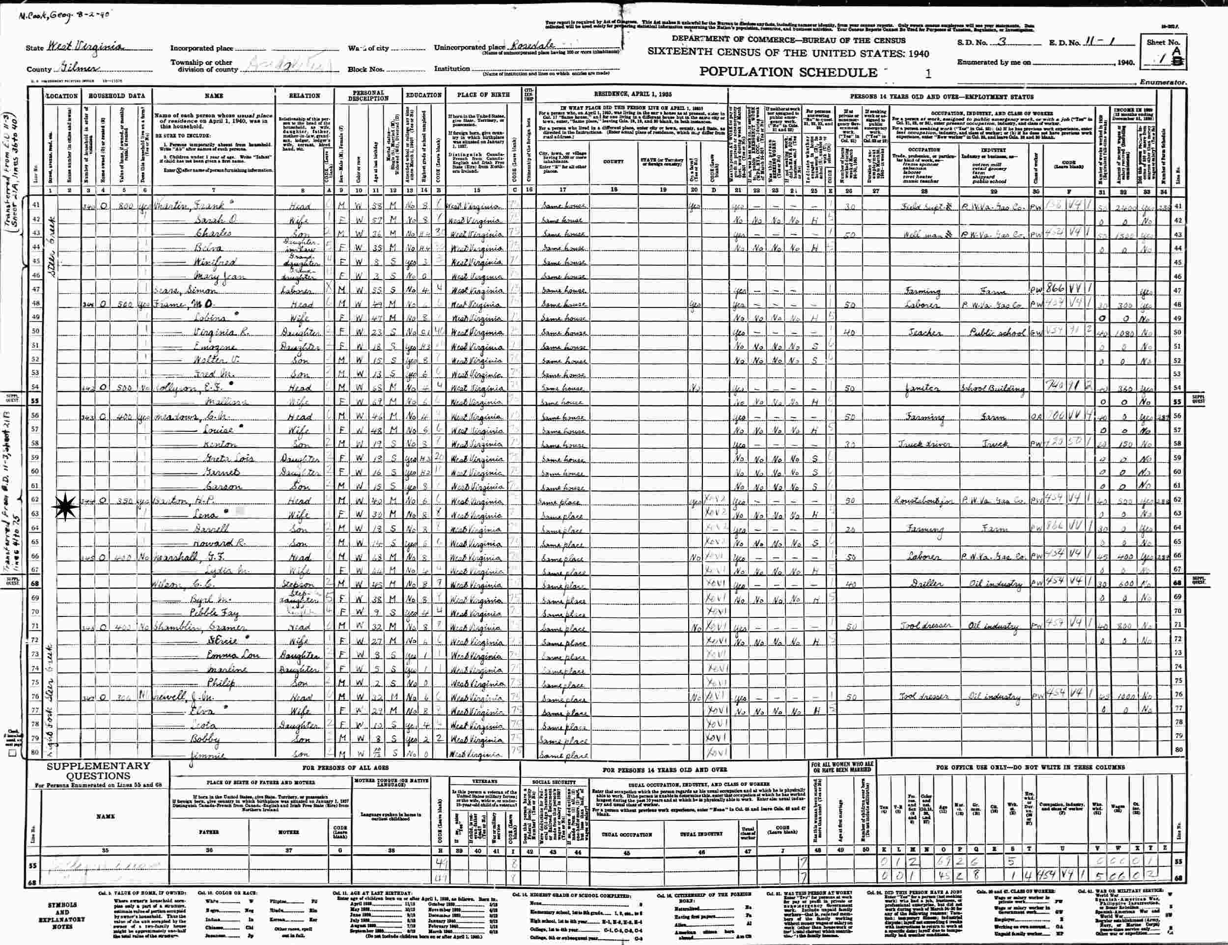 1940 - Supervisor's District 3, Enumeration District 11-1, Rosedale, Gilmer County, West Virginia.