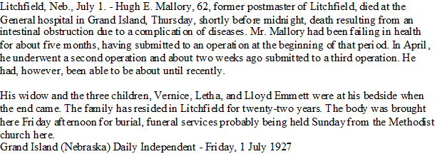 Died: June 30, 1927 in Grand Island, Hall County, Nebraska.