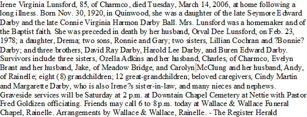Notes for IRENE VIRGINIA DARBY LUNSFORD: