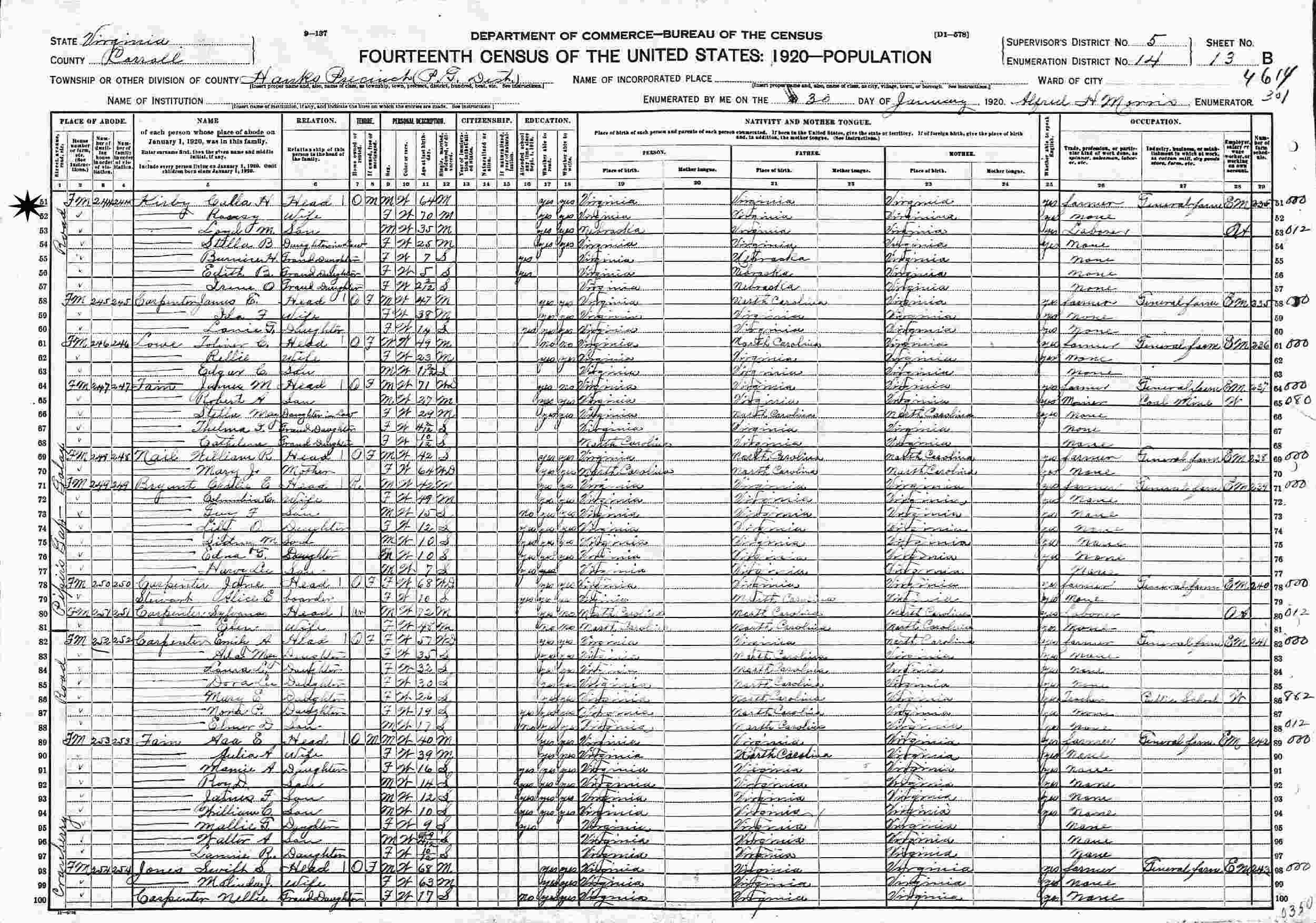 January 30, 1920 - Piper's Gap-Galax Road, Supervisor's District 5, Enumeration District 14, Hanks Precinct, Pipers Gap District, Carroll County, Virginia (w/paternal grandparents).