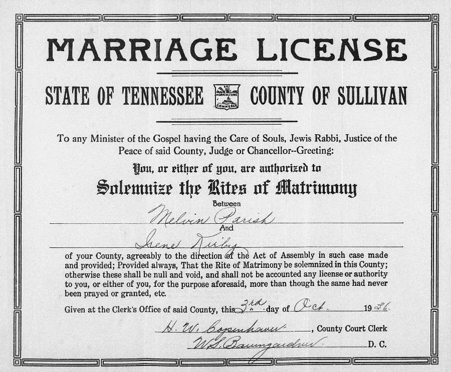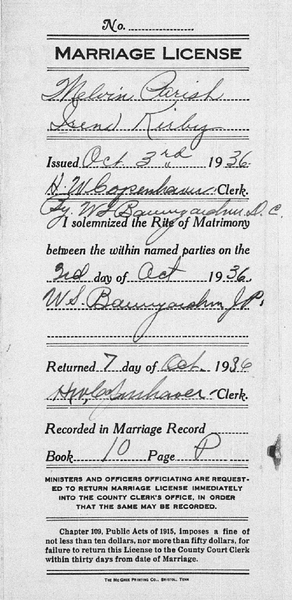 Married: Melvin Gray Parrish October 3, 1936 in Sullivan County, Tennessee.