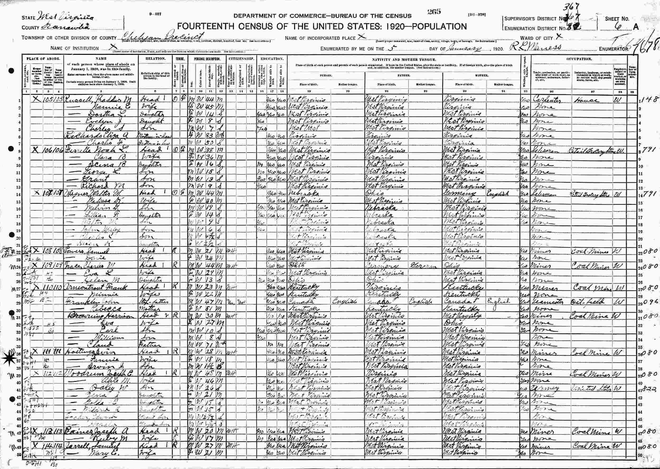 January 5, 1920 - Supervisor's District 367, Enumeration District 82,Chelyan Precinct, Cabin Creek, Kanawha County, West Virginia.