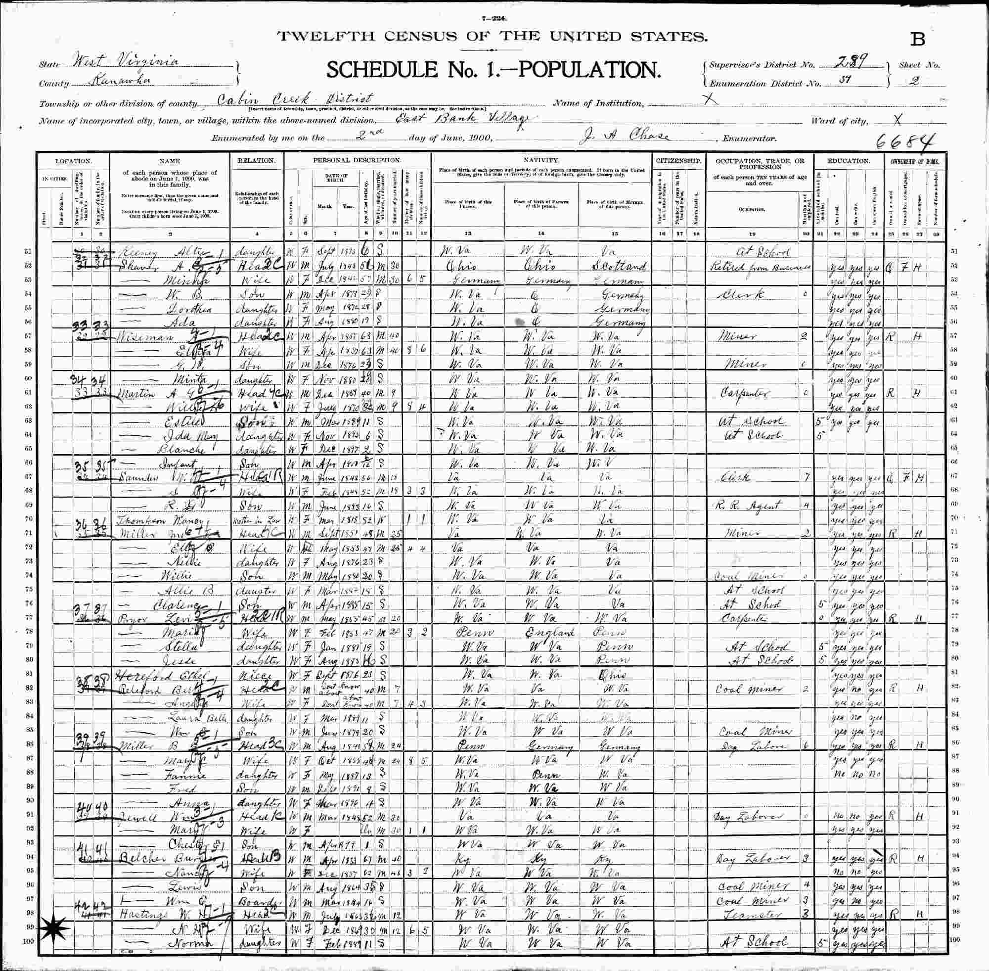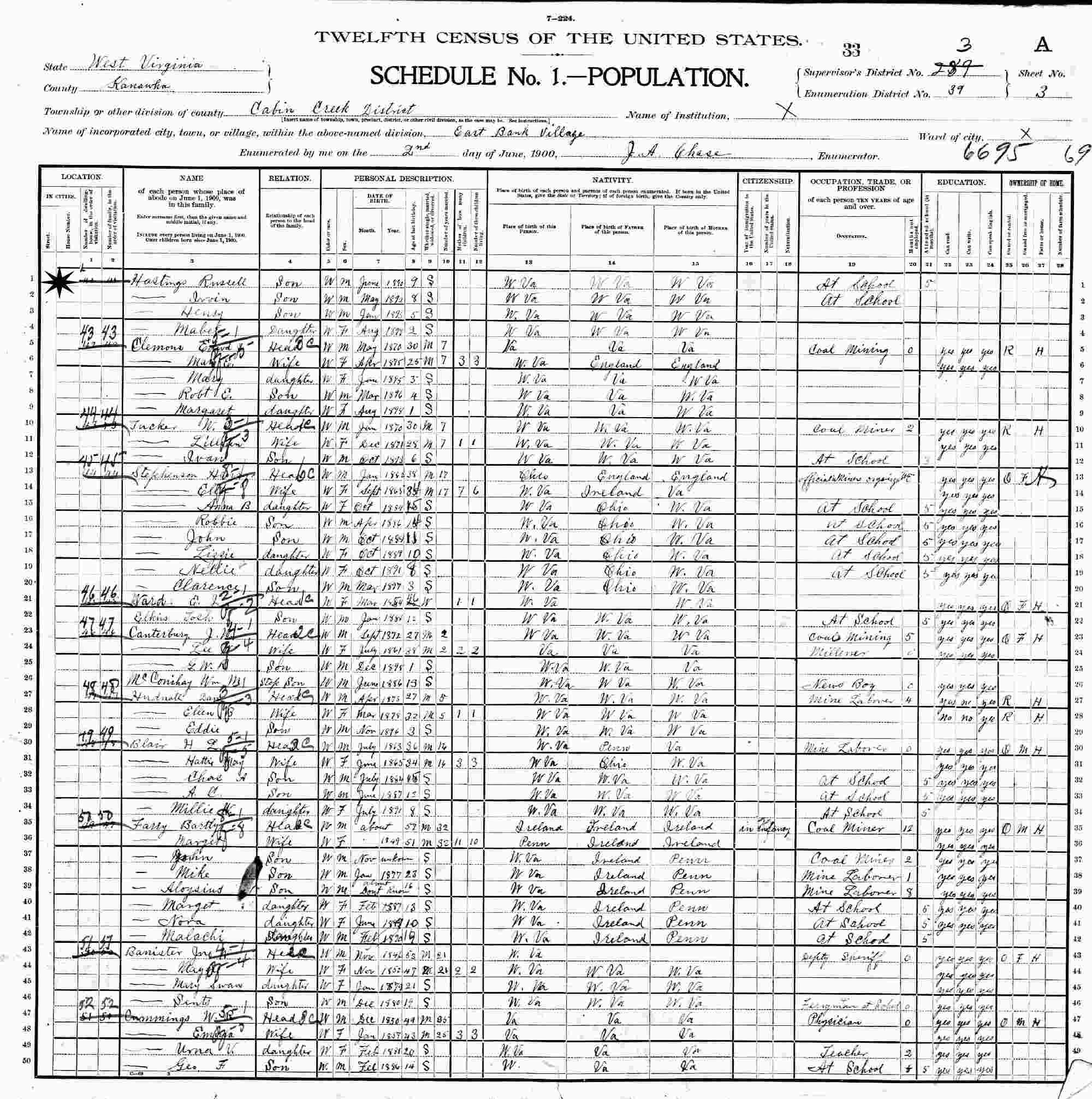 June 2, 1900 - Supervisor's District 289, Enumeration District 39, East Bank Village, Cabin Creek, Kanawha County, West Virginia.