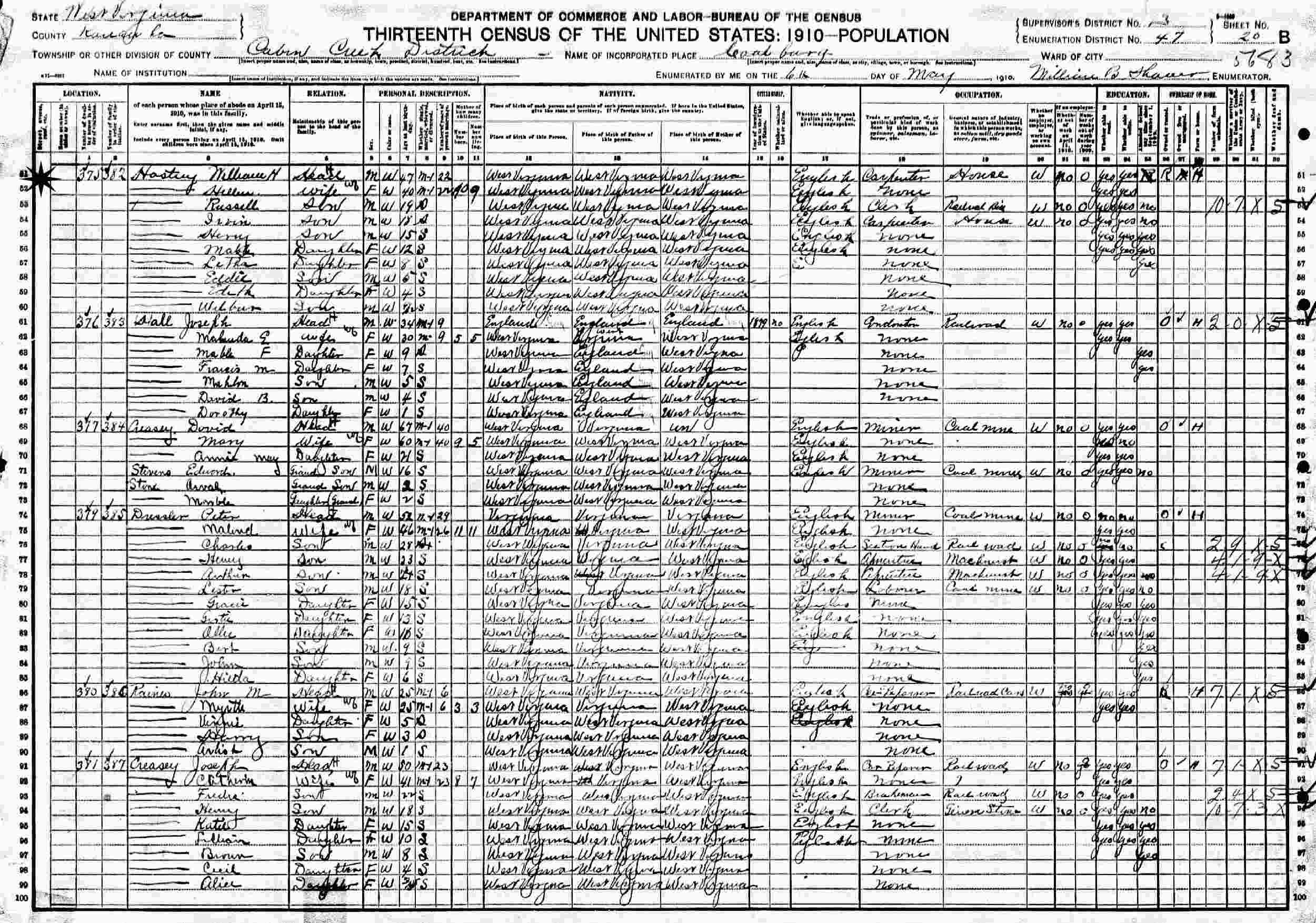 May 6, 1910 - Supervisor's District 3?, Enumeration District 47, Cabin Creek District, Coalburg, Kanawha County, West Virginia.