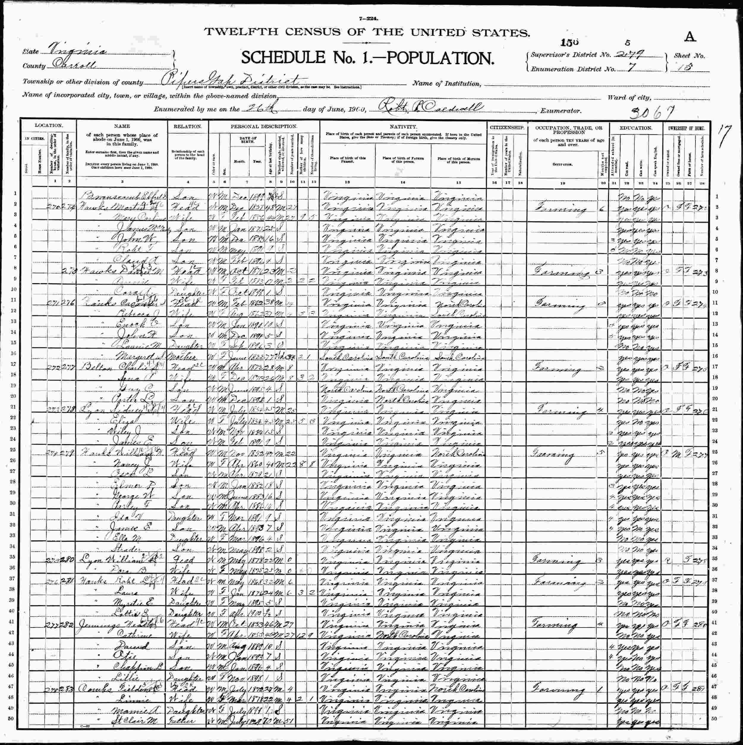 June 26, 1900 - Pipers Gap District, Supervisor's District 279, Enumeration District 7, Carroll County, Virginia.
