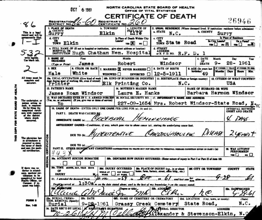 Born: December 5, 1911 in Elkin, Surry County, North Carolina.