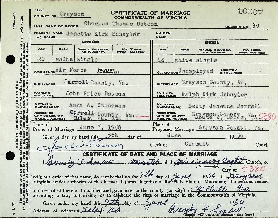 Married: Charles Thomas "Tommy" Dotson June 7, 1956 in Grayson County, Virginia.