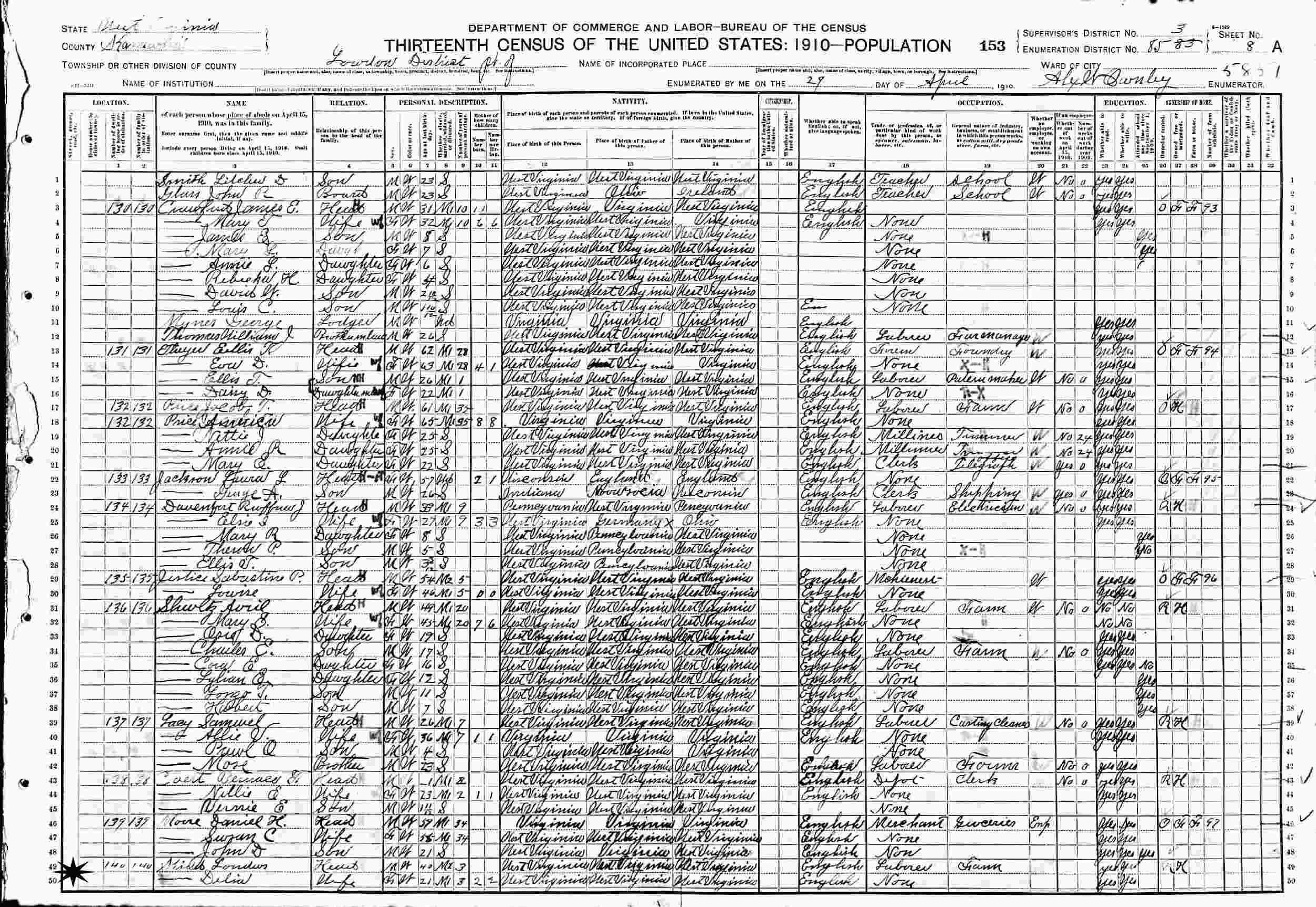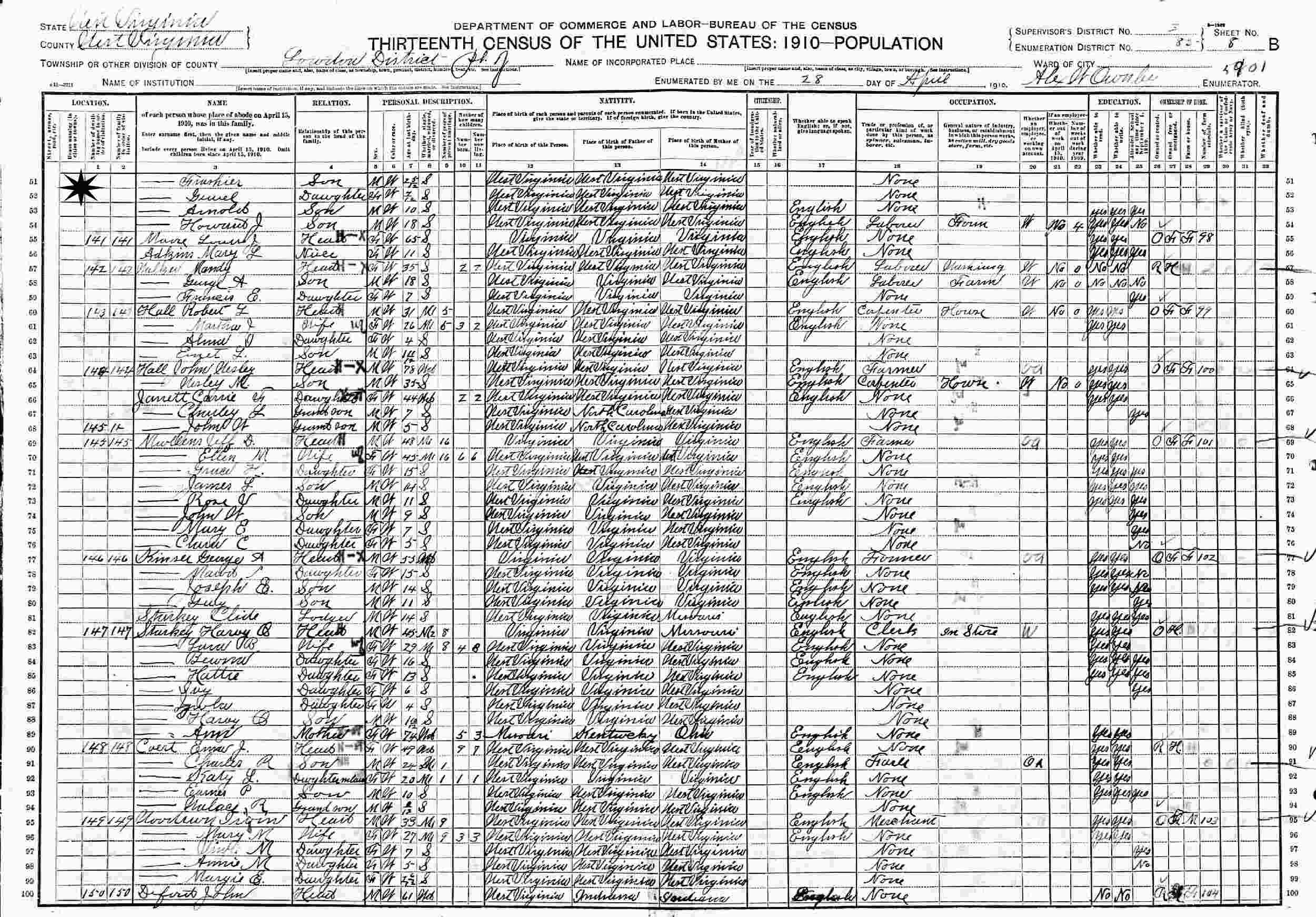 April 29, 1910 - Supervisor's District 3, Enumeration District 83 (crossed out to 85), Loudoun, Kanawha County, West Virginia.