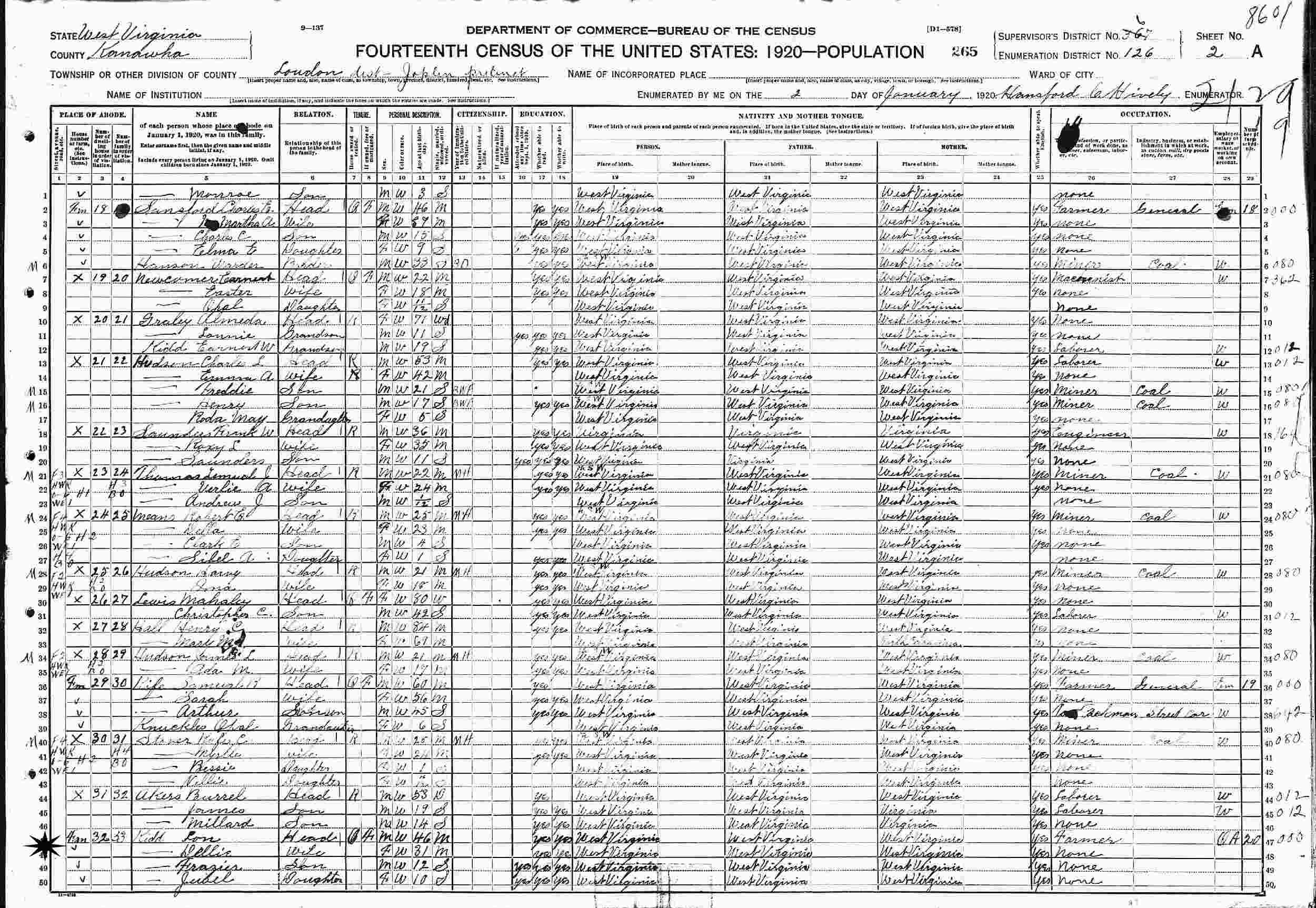 January 2, 1920 - Supervisor's District 367 (crossed out to 6), Enumeration District 126, Loudoun District, Joplin Precinct, Kanawha County, West Virginia.