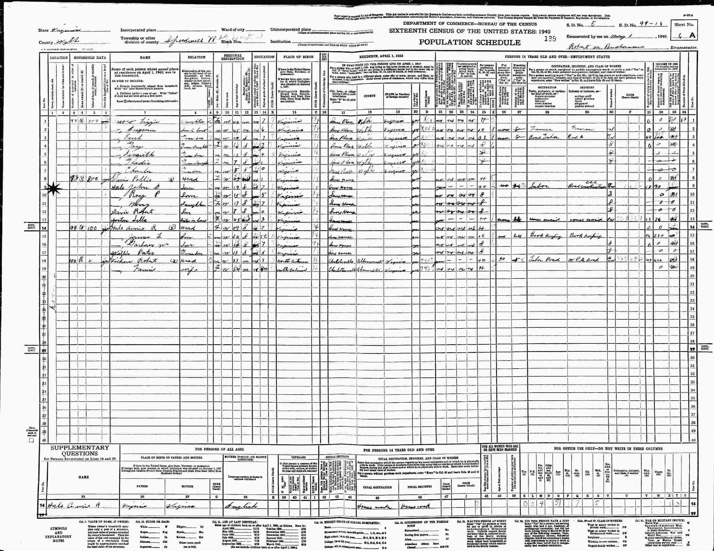 May 1, 1940 - Speedwell Magisterial District, Supervisor's District 5, Enumeration District 99-16, Wythe County, Virginia.