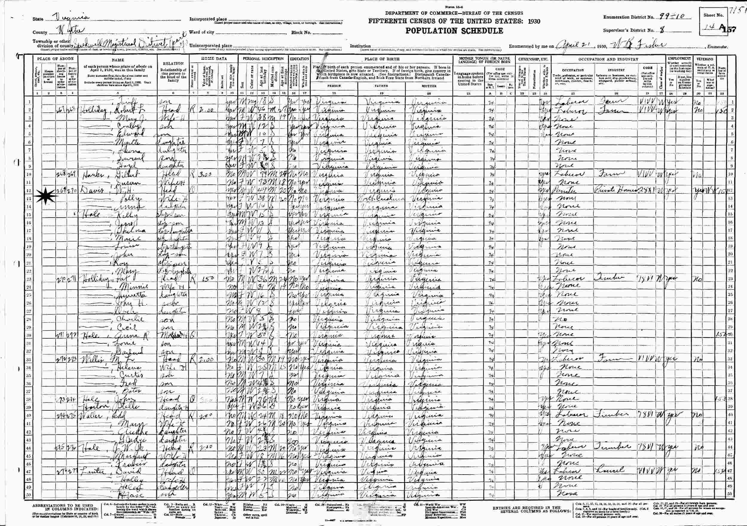 April 21, 1930 - Speedwell Magisterial District, Supervisor's District 8, Enumeration District 99-10, Wythe County, Virginia.
