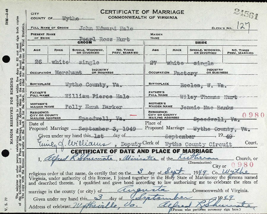 Married: Pearl Ross (nee Hurt) Toothman September 3, 1949 in Augusta, Wythe County, Virginia.