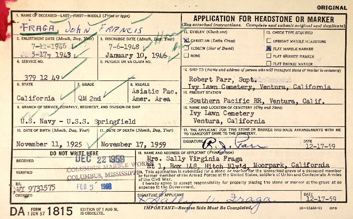 Notes for JOHN FRANCIS FRAGA: