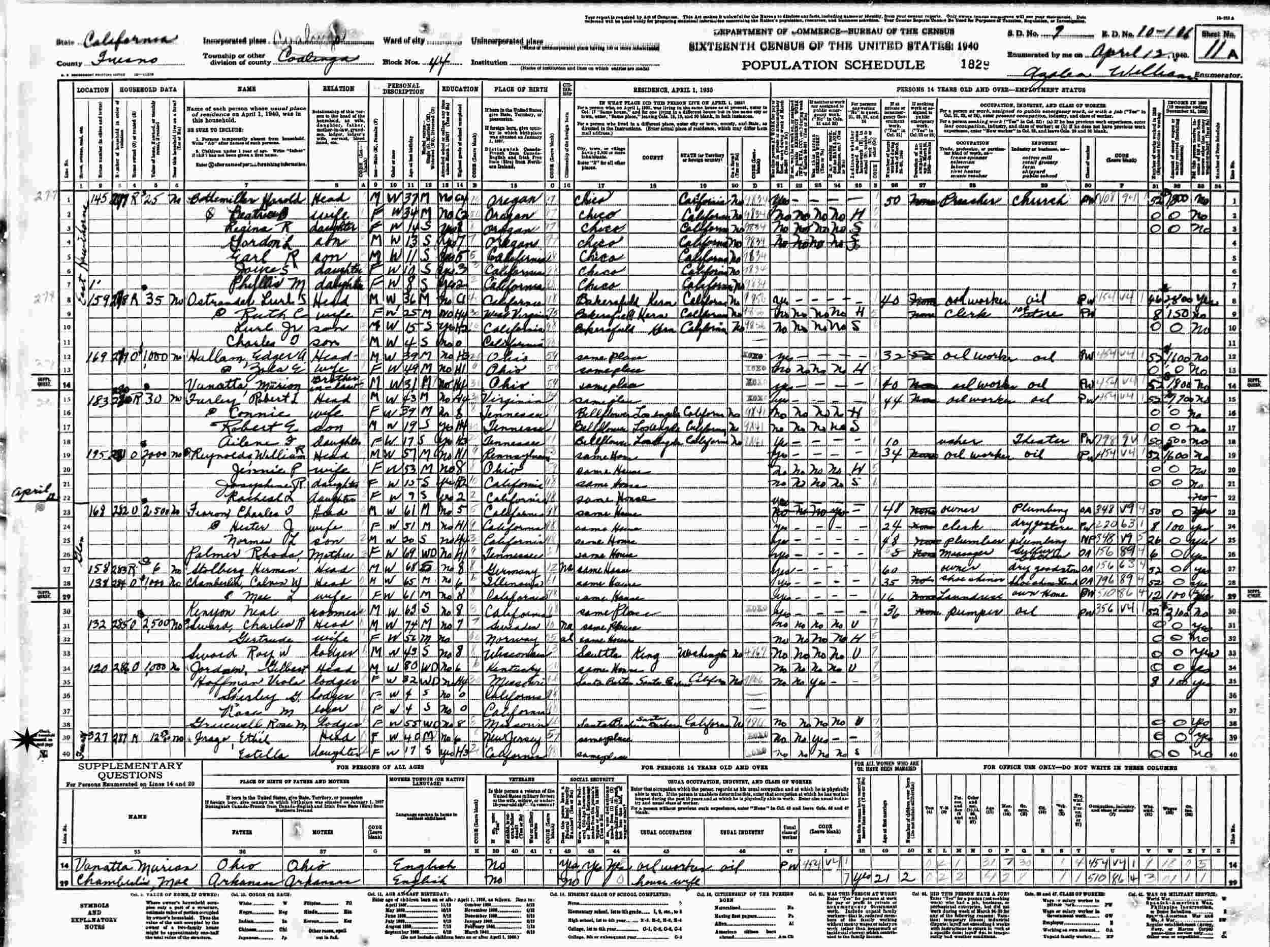 April 15, 1940 - 327 Fourth, Block 54, Supervisor's District 9, Enumeration District 10-??, Coalinga, Fresno County, California.