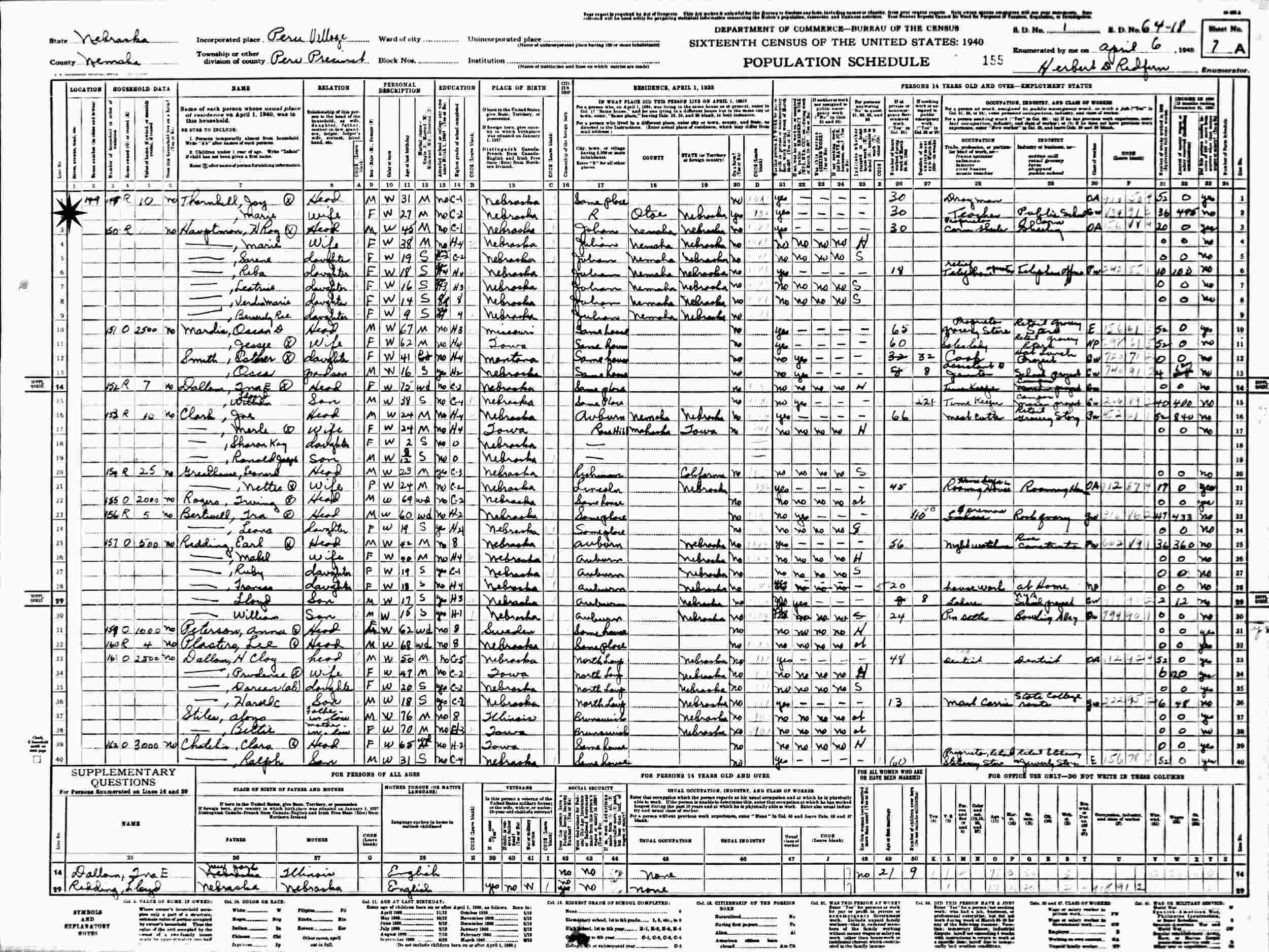 April 6, 1940 - Supervisor's District 1, Enumeration District 64-18, Peru Precinct, Peru Village, Nehama County, Nebraska.